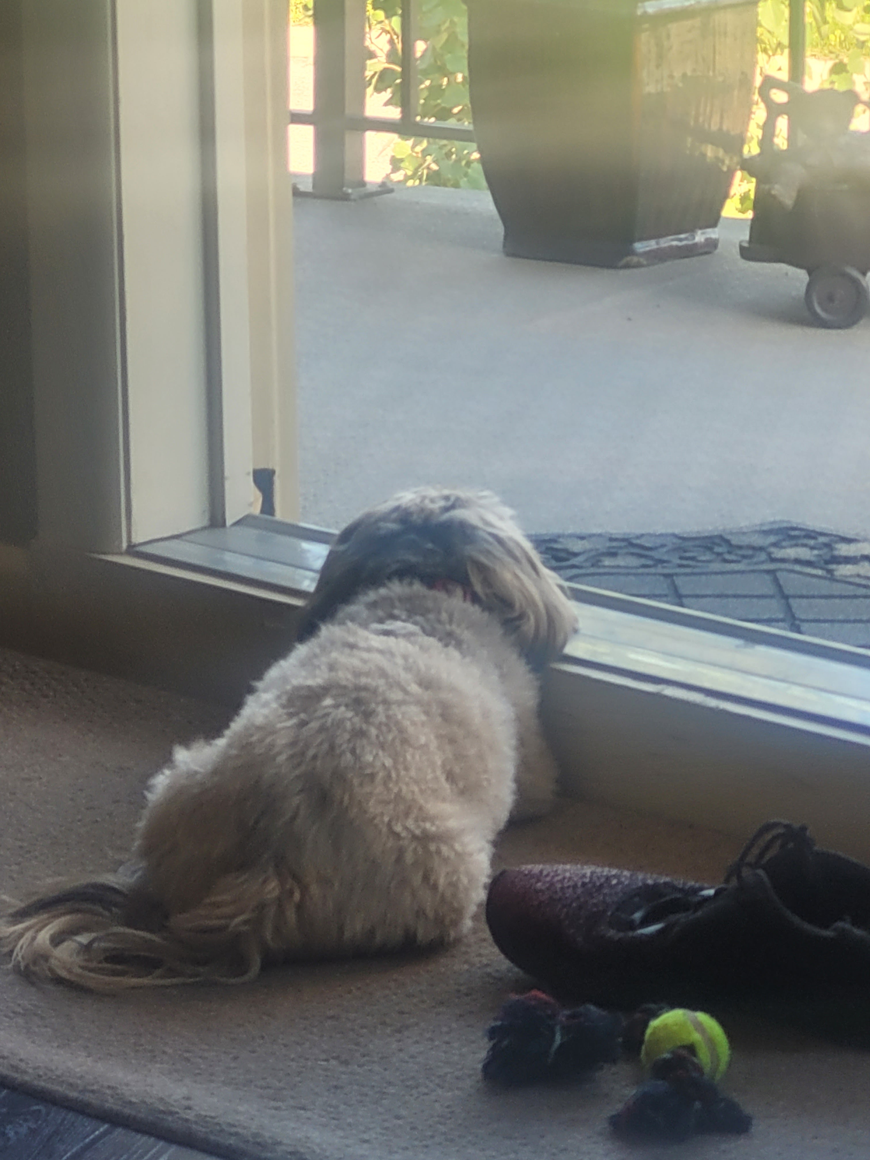 This is Daisy’s happy spot. The patio door open and her chin resting on the sill as she watching the going-ons outside.