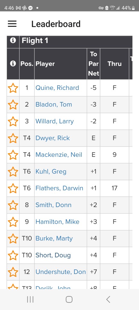 I started off strong taking a 40 on the front nine with a triple boogie in there. Numerous birdie shots that didn’t happen but 7 Pars one triple and one boogie I can life with. The back nine I fell apart. The back mind you is much harder but costly errors and missed drives hurt me. Disappointed as the front nine was real fun.