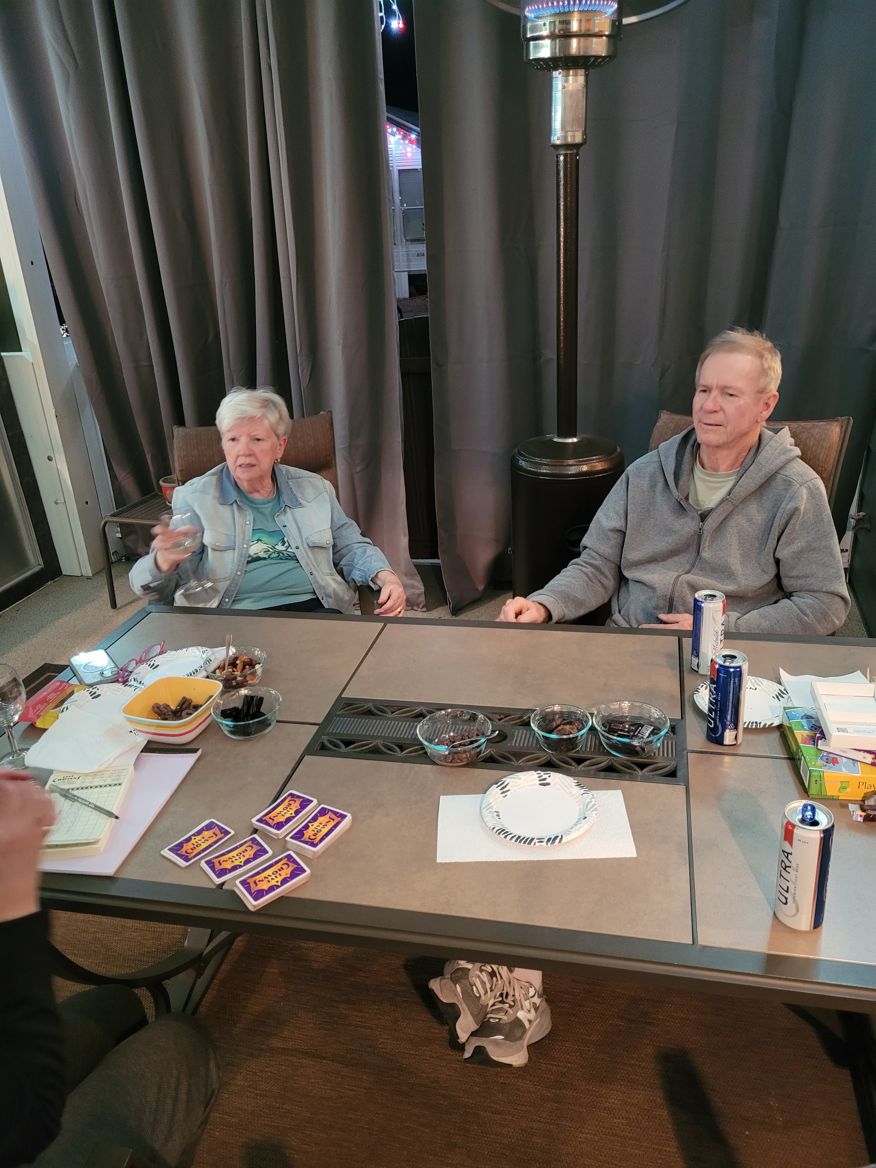 Then we moved on to a game that we have heard of many times but never played. This game is simple in play but being taught it at first it seemed quite convoluted. I thought it had to be created in Saskatchewan. We have experienced some games played there that are unique yet fun. But is a old game from the 1800’s . Euchre and Whisk supposedly are similar. I like the game a lot. Someone decided that the Jacks are the power cards. They must have pulled that idea out of the air. The Trump Jack and the color matching Jack from the other suite are the first power and second power cards. Takes a bit to get that right. Fun game and glad we were taught it as many people do play it. I think all of the games overall ended up in a tie.
