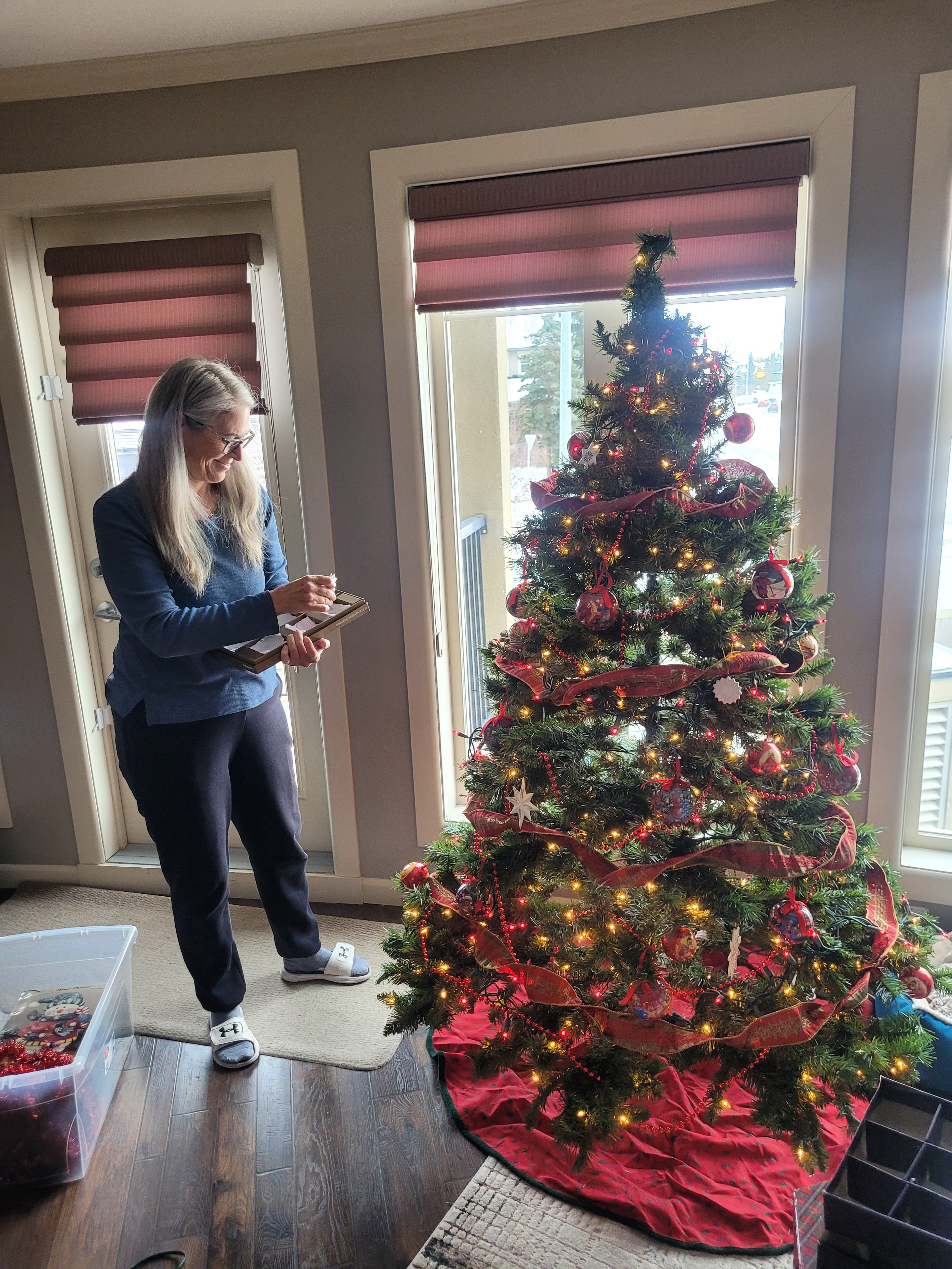 Today we started decorating for Christmas. We got most everything complete and we realize I forgot one big box in storage. Now I rent the space out so I cant access it now unless the guy leaves and I rush. Soooo we will do without but it is that nicest ornaments missing and the tree topper and the wrap. I will label the boxes for next year. Darn . I especially loved the large red pheasant and the glass icicles. Missing the topper is funny. Maybe I can convince Jackie to make one. Every family had to put up ugly decor from kids.