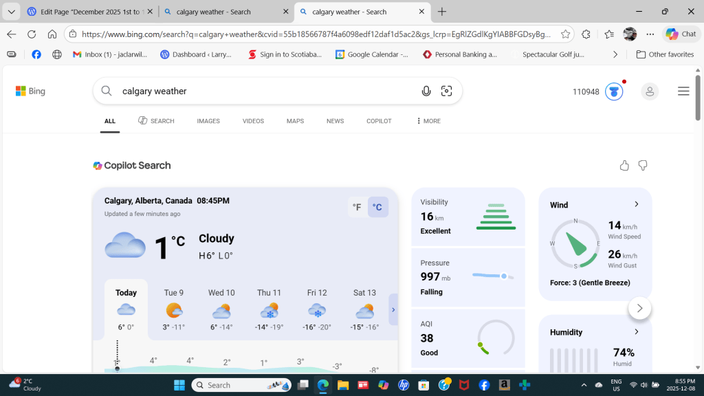 Jackie has been awesome getting presents delivered Audrey’s to help with the rush to get things done. We have to decorate our condo when we get home. Buy a pile of groceries not only to live but for our meal gatherings. We have a few things on our agenda that I know of. A trip up to Edmonton to visit with Mom for Christmas, a family gathering the week before Christmas, a family supper outing for Atti’s birthday as promised, a Christmas get together at Spruce Meadows, get in a Jackson hockey game or two, a turkey meal for Christmas Day, some doctors appointments for Jackie & I, see if the Graces are well enough to go out, go to AMA to register our vehicles, get Daisy another hairdo, gift shopping and a plethora of other related things to get done.