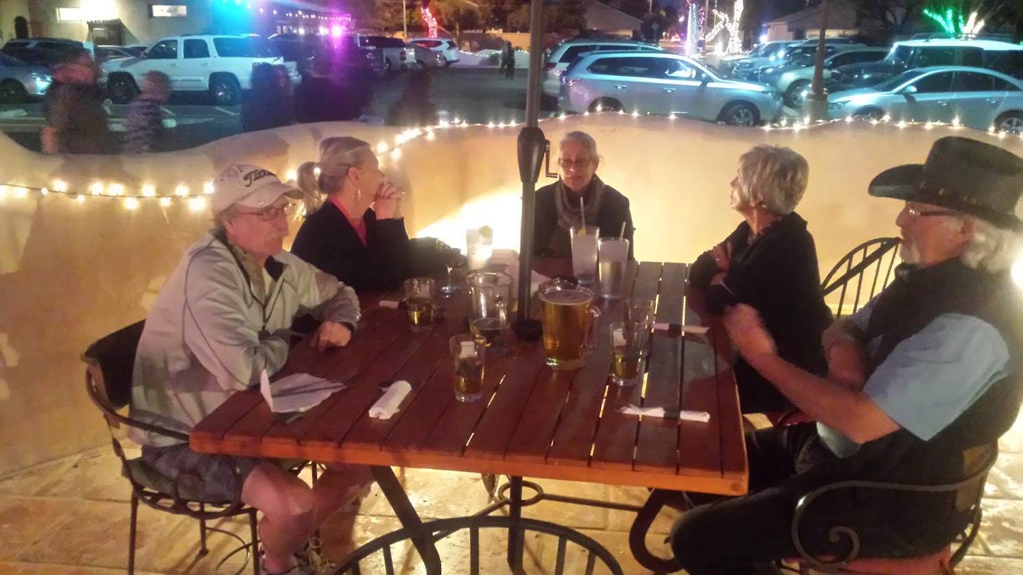 Ron P generously offered to host us on Fat Willy’s patio. JUGS yes, I said jugs. We ordered jugs of beer. Chicken wings and onion rings that all were delicious.