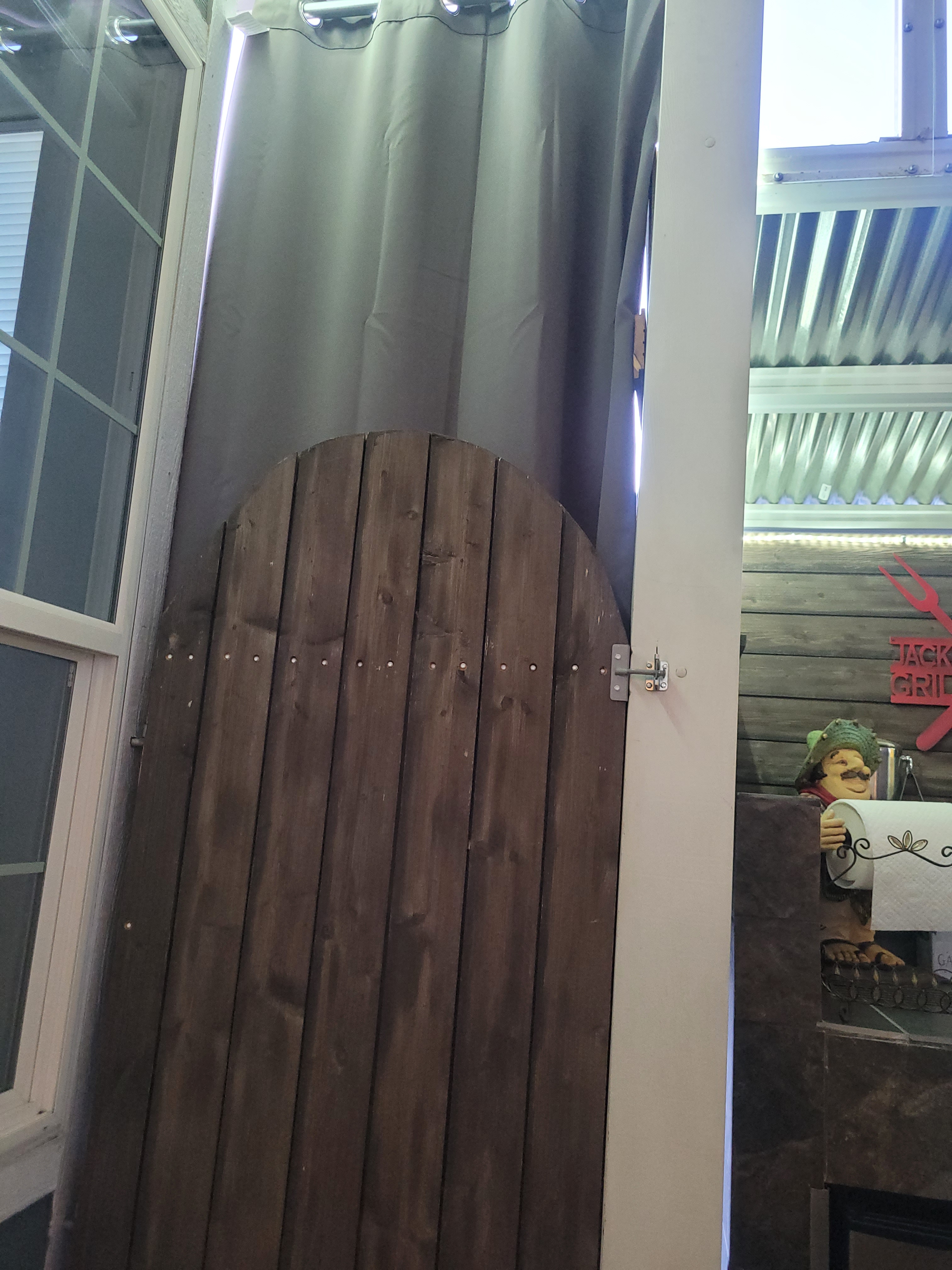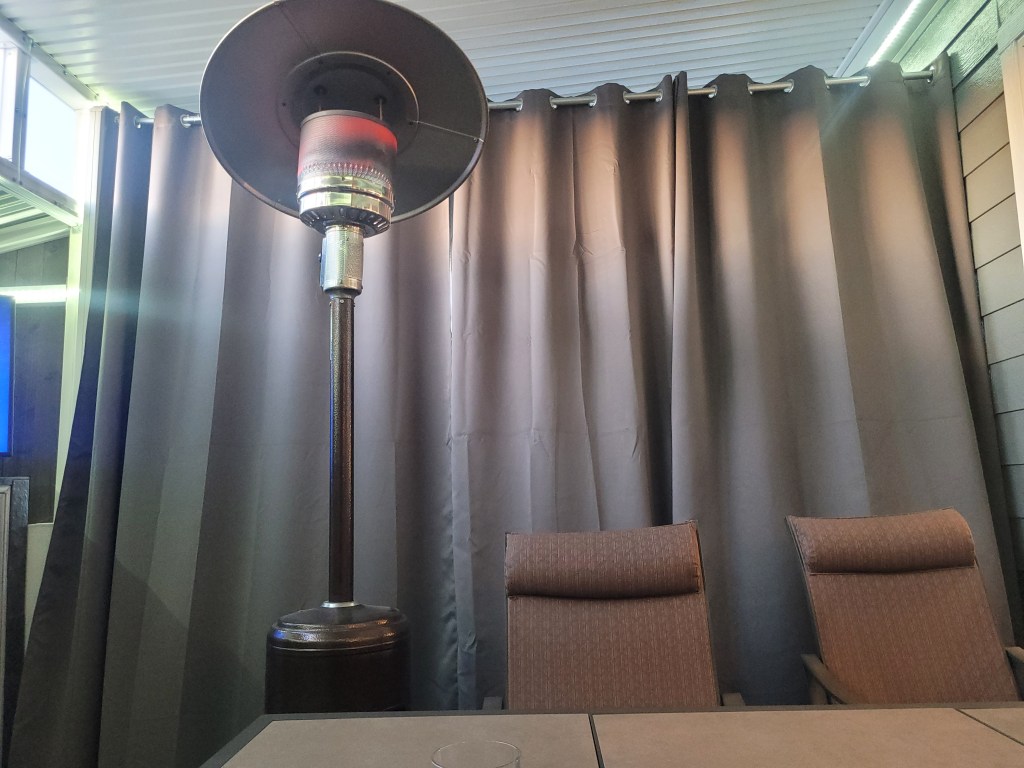 I started with my rope and clip system to hold the curtains closed during wind. They have a loop system but also a rod pocket on the bottom that I chose to use. Two quick clips so we can pull them back when needed.