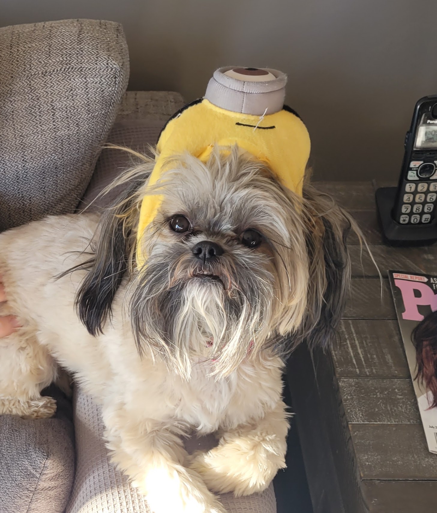 Daisy was misbehaving today so as it is a new world we put on her Minnion hat . That will teach her. LOL