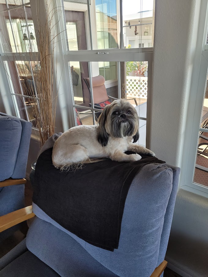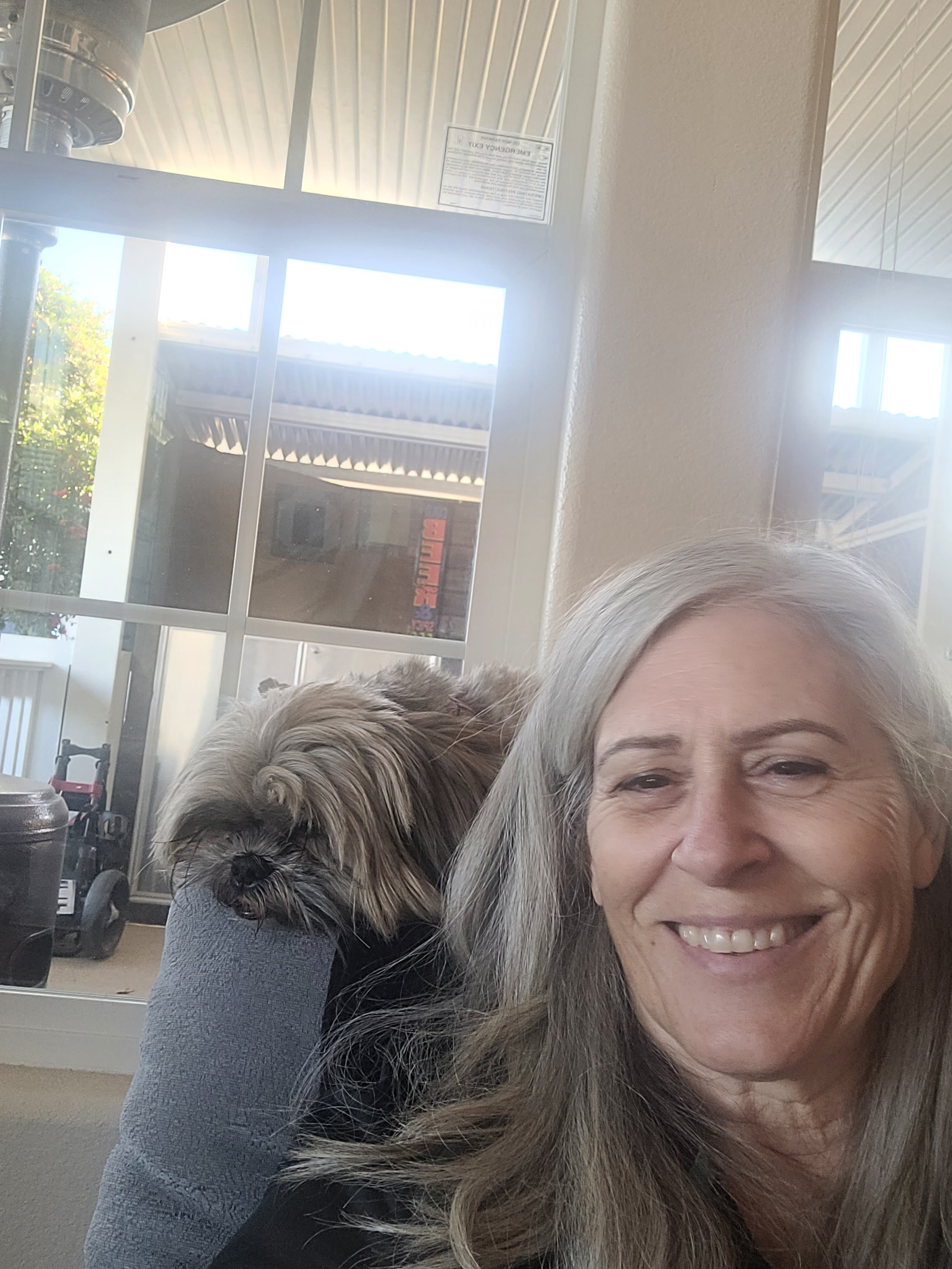 Daisy patiently waiting at the gate to board the plane. We boarded right on time. Great flight with no one in our row which works out perfect. Daisy was 99.9 % perfect.