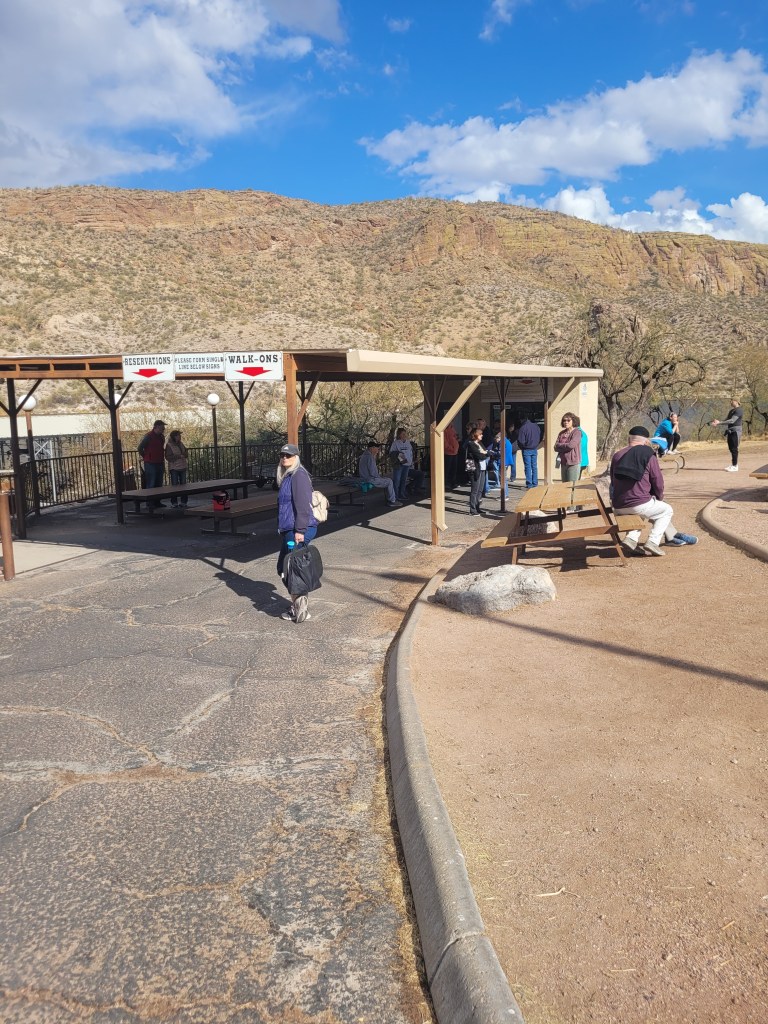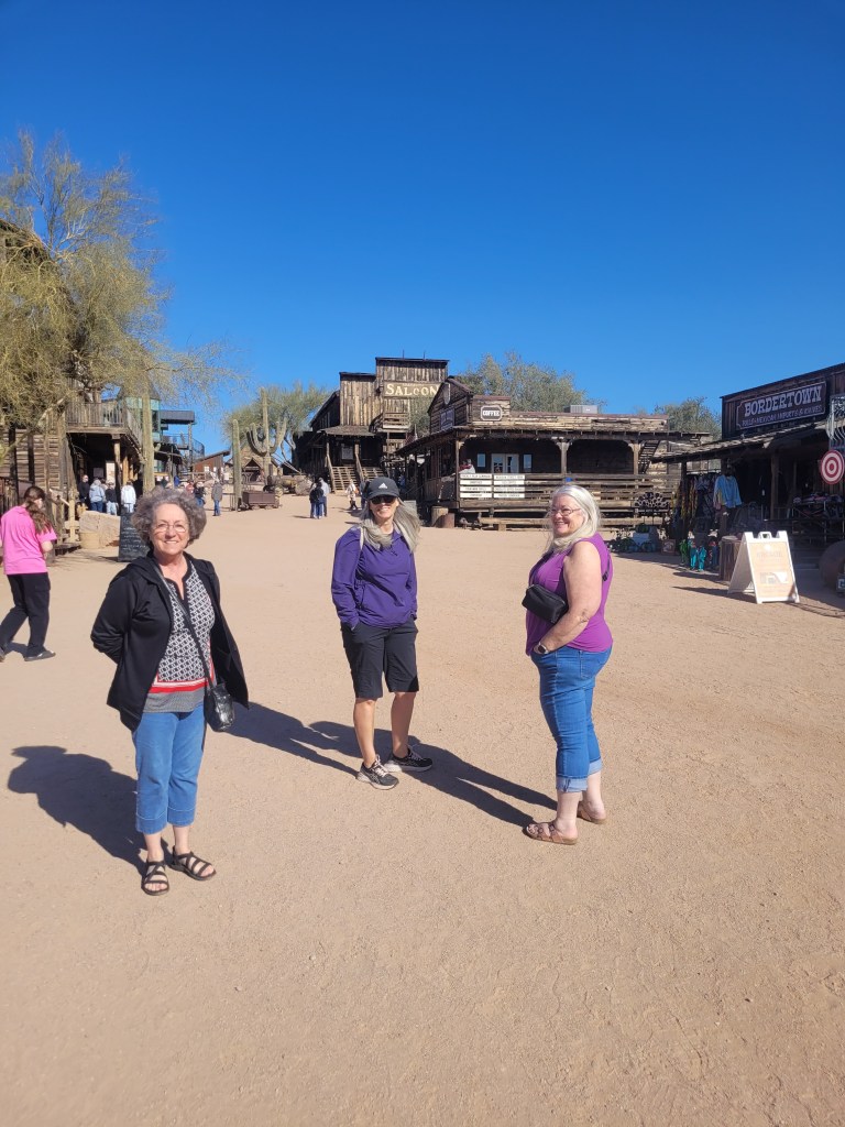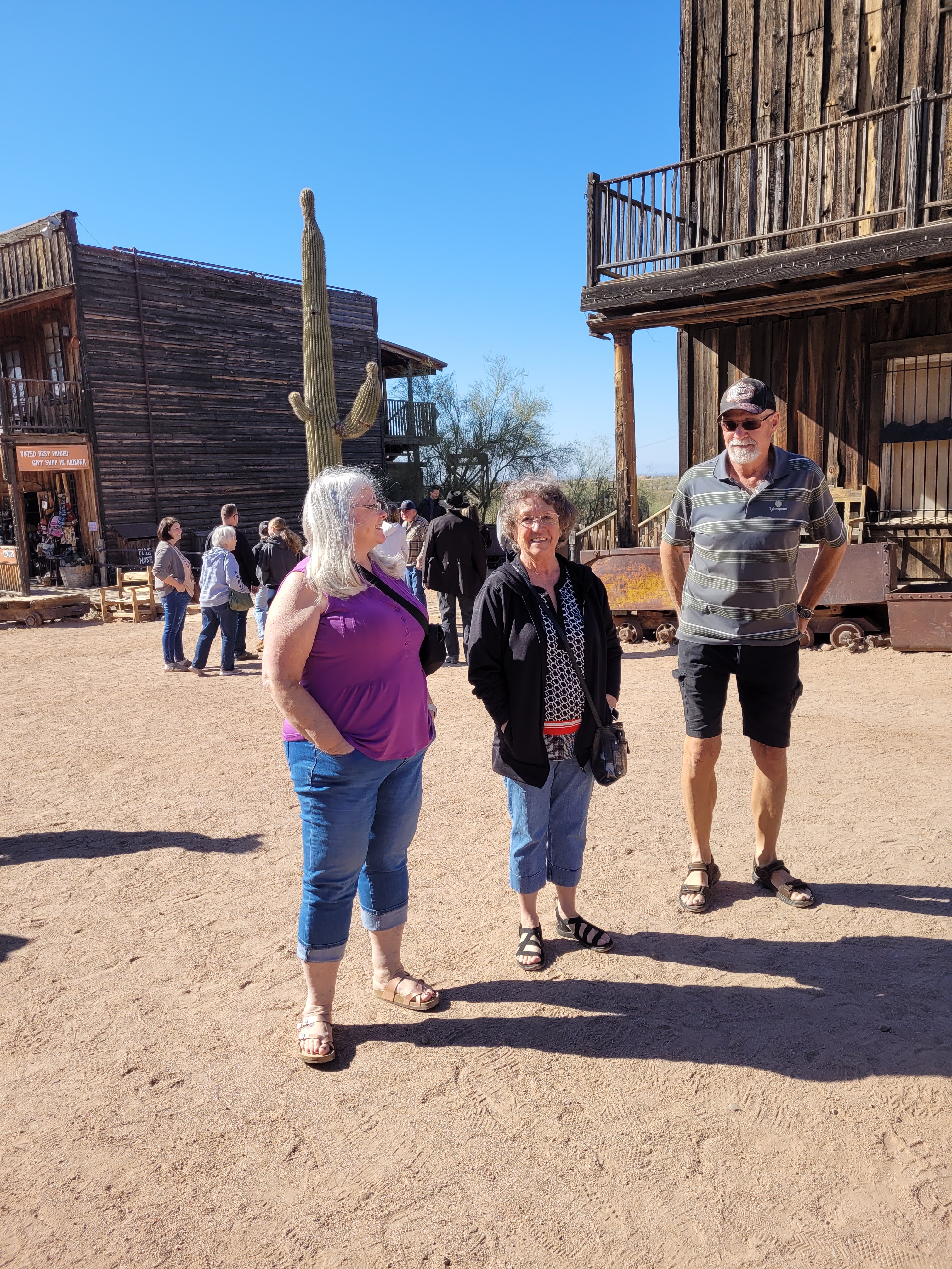Today’s plan was the Apache Trail. In the car and we headed out. First stop was the Goldfield Town an historical old gold mine tourist place. I love this place. We stopped in the shops. We looked in the general store. We visited the Mystery House, which is a wacky tilted house tour. It was a blast. Jackie & Mary were lucky enough to “volunteer” which was fun seeing them struggle with the circumstance.