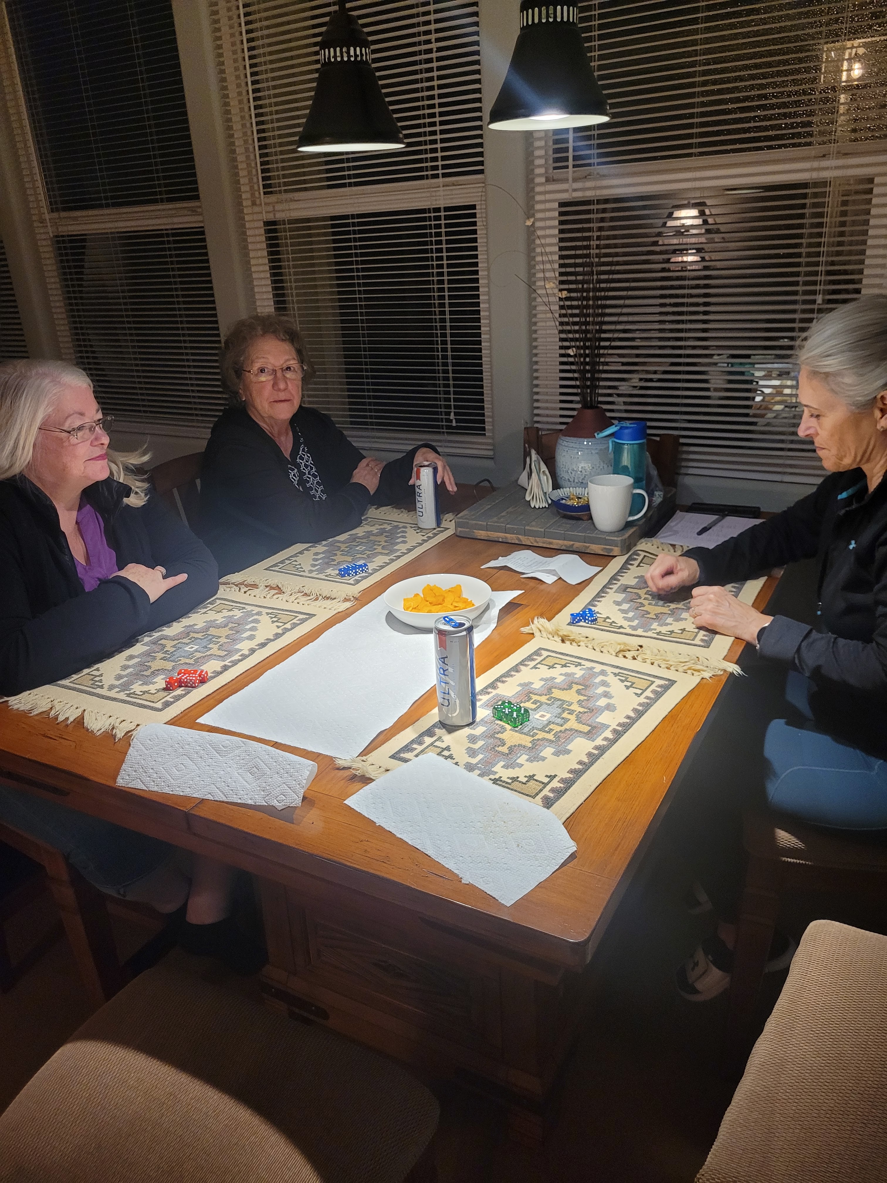 Tonight’s game night was crib and dice. It ended up with a mixed bag. In Bones Dice I had a easy win the first game. The second game something happened I have NEVER seen before. Darlene wins the game and I never entered the game. Every roll and not getting the 1000 to enter the game. I haven’t seen that before. It is too bad it happened to me. This is a record that I don’t want to happen again. LOL In crib Mary & I won the first game which was quite close. The second game another real close one with the last hand being the deciding factor with Jackie & Darlene winning. So a mixed bag of wins and losses. One loss I dislike. LOL