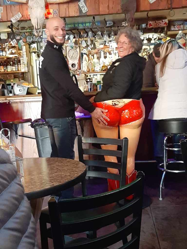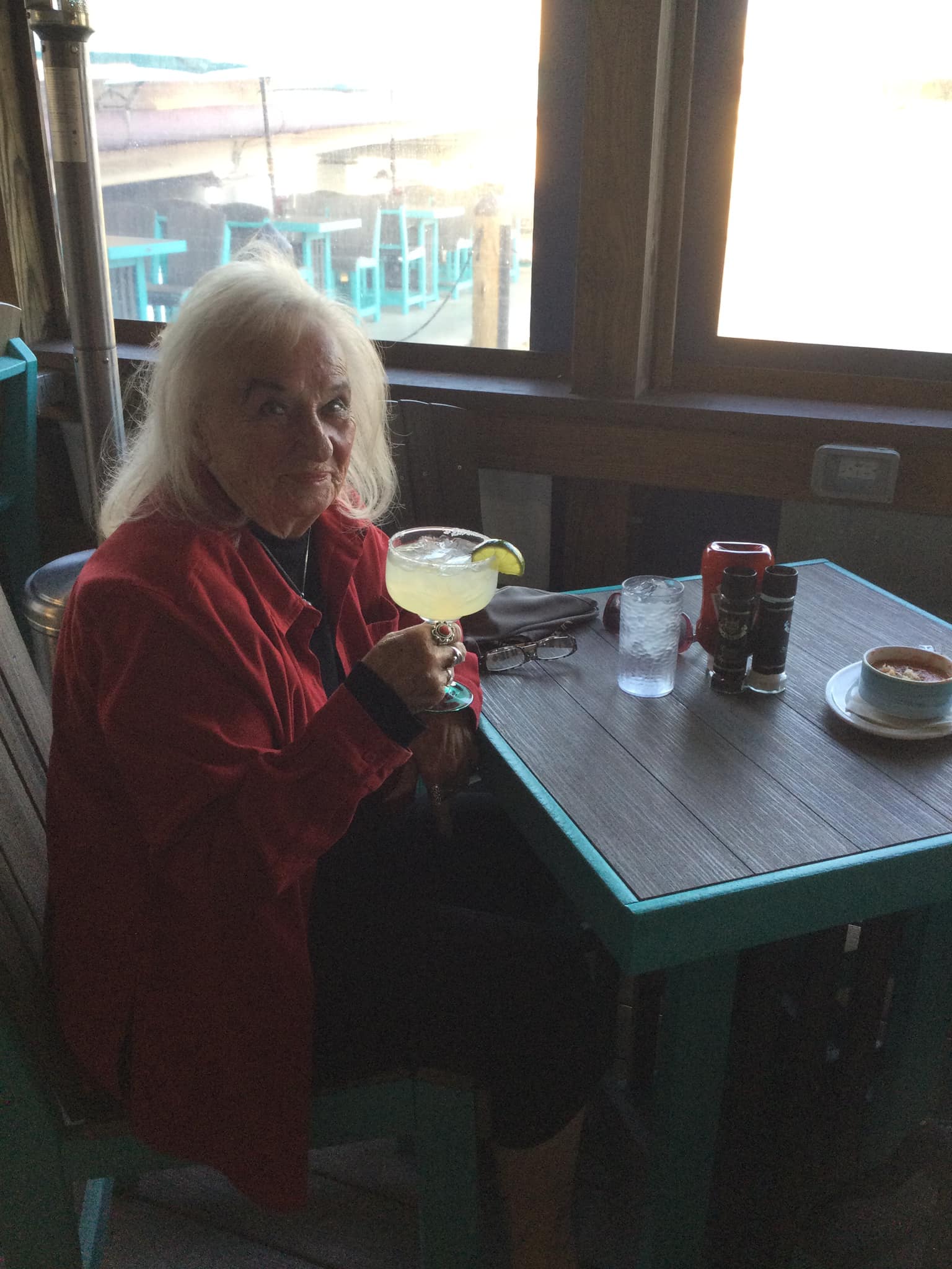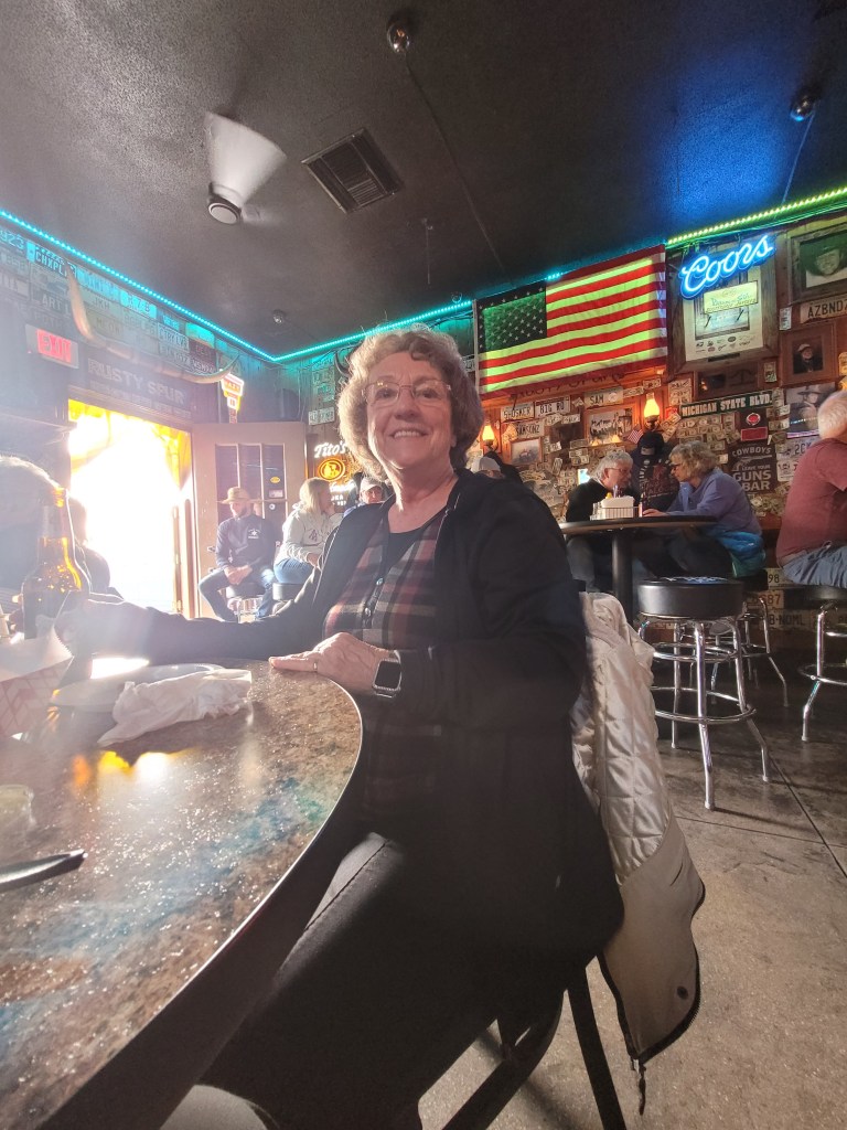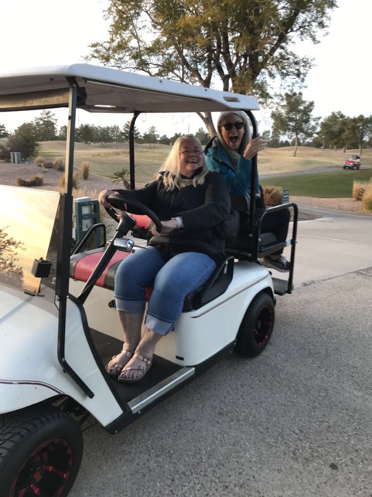 I thought I would let Darlene drive the golf cart to Fats. I guess by Jackie’s expression it wasn’t too eventful. Arizona Parking lot.