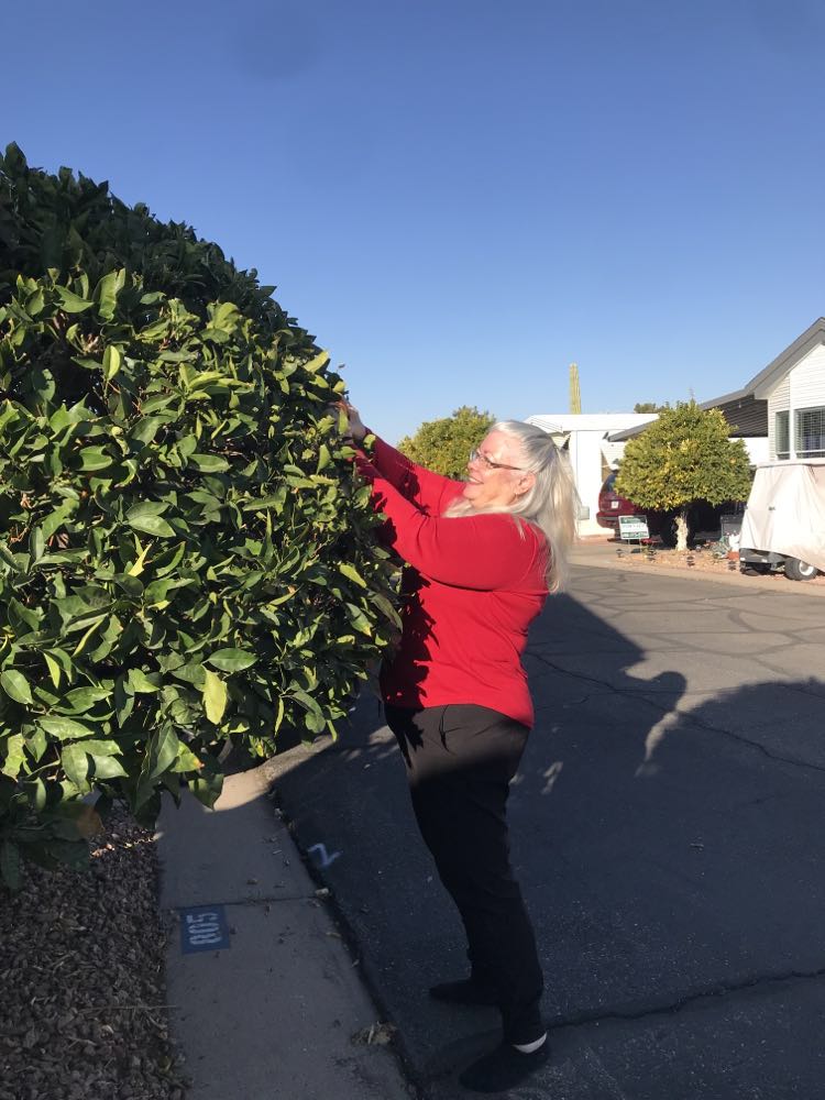 Here is Darlene having her orange a day. They are very juicy right now and only two steps off our doorstep.