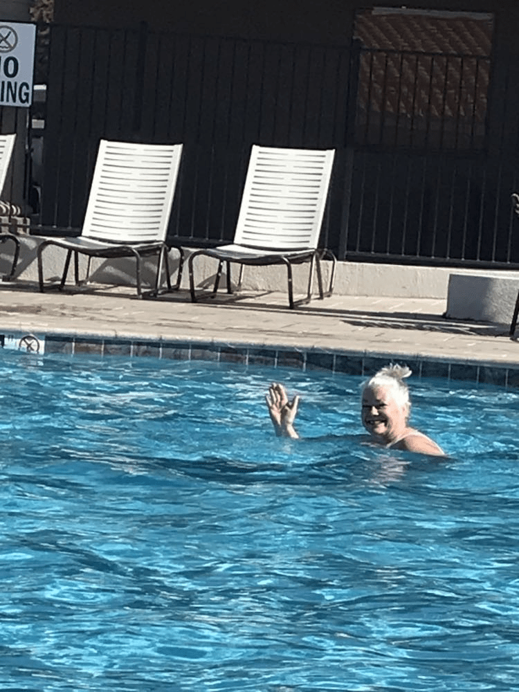 But wait, it wasn’t the end. Darlene and Jackie headed to the pool. Anyone who has swum in our pools knows how nice and warm they are. Even if it’s cool outside, they will love the warmth of the water. The morning noodle ladies need it warm.