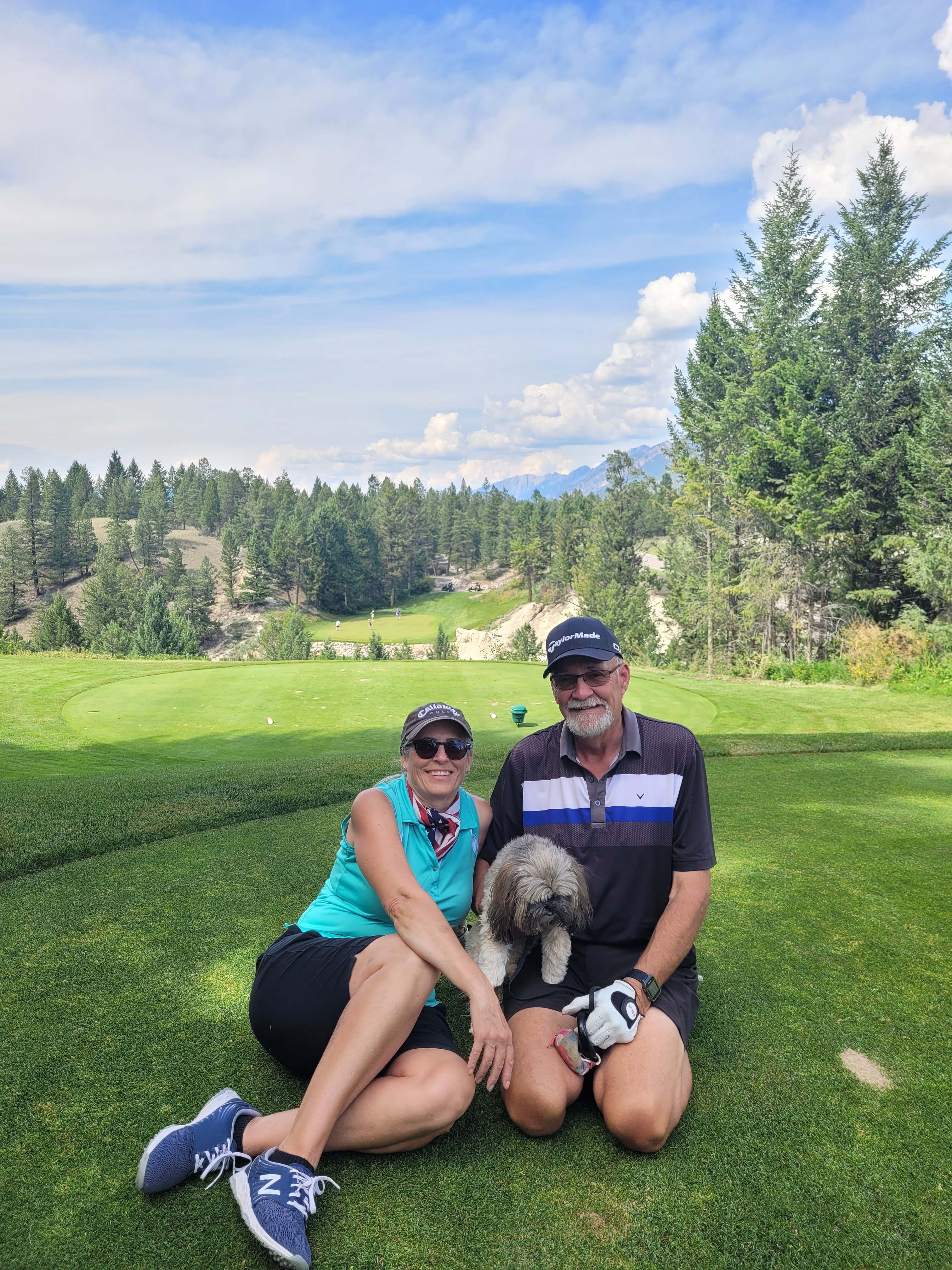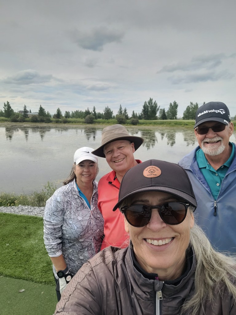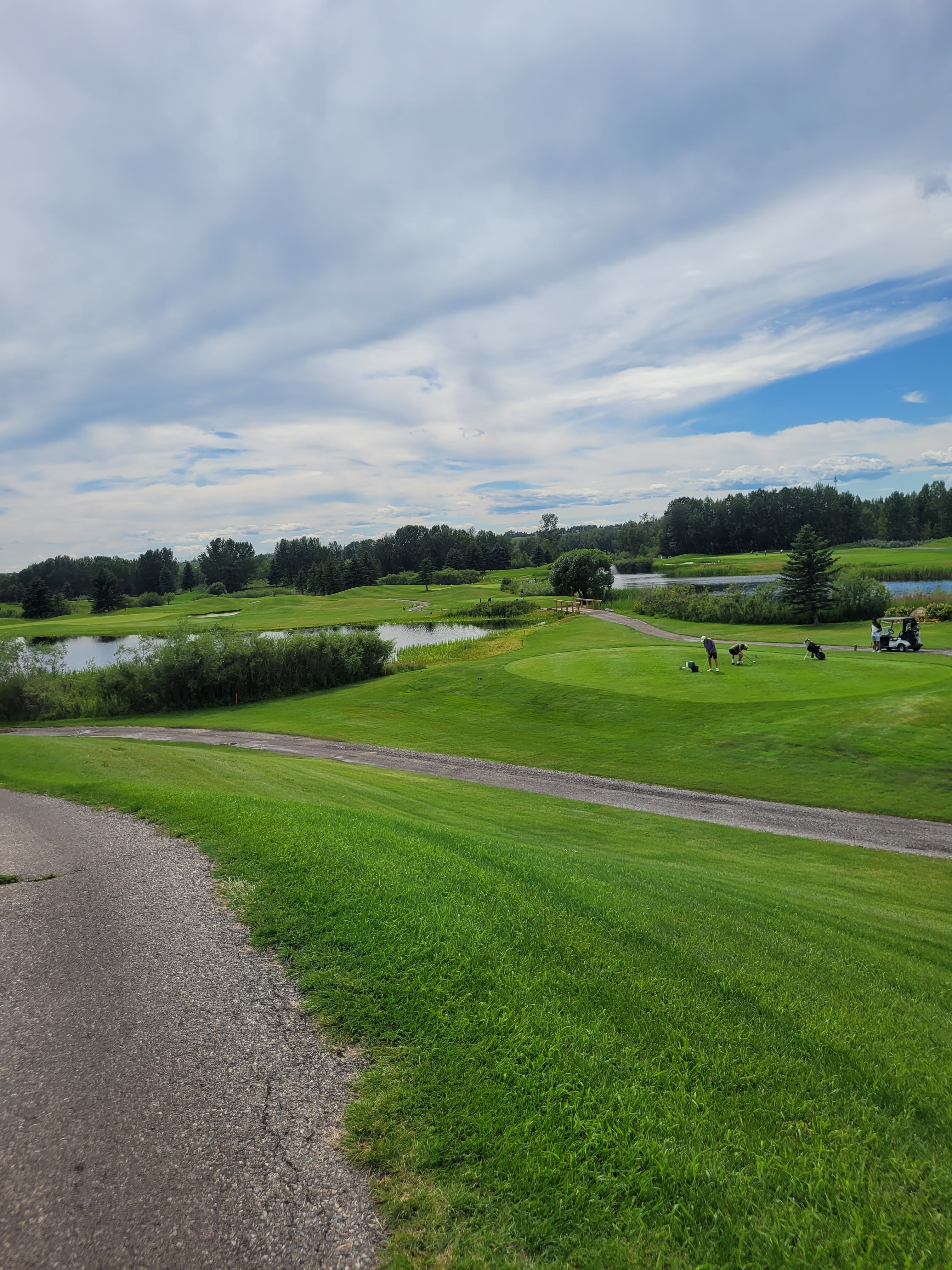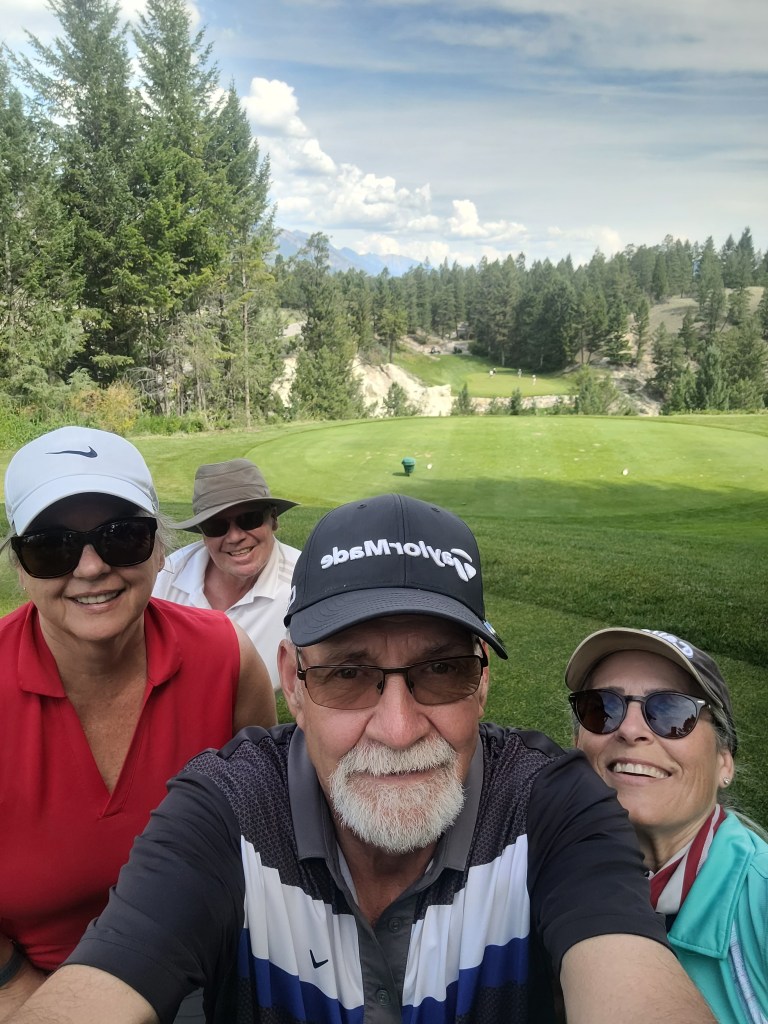 Today it is warm hitting 27 degrees which is just about perfect for golfing. We were golfing with Jeff & Wendy today at Copper Point. I have golfed here a few times but today my memories and reality seemed different. It is a gorgeous course with a wonderful set up. A mountain course but friendly enough. First drive , no warm up, screwed up, but after that the front nine was wonderful. 7 Pars and two bogies was a great start. I was driving well today. The back nine a complete different story. Still played well but would hit a 250 yard drive and run into the bush. Lost ball. Not knowing the course doesn’t help. Double bogie heaven happened on the back nine with mistakes, weird lost balls and bad luck. On one Par 5 a great drive and I was down in a gulley with 220 yards left to the green. The group in front of us was slower all day. I dropped into the valley and thought by now they should be gone. I hit the ball perfect. I drove up to the top of hill. No ! My ball landed 5 ft from the hole and they were still on the green close to the hole. Jeff and the group had a bit of conversation which I didn’t here as we were a way back. I am sure neither party could hear one another. I don’t like to do that and shouted sorry but no reaction from them. Good thing no hockey players involved.