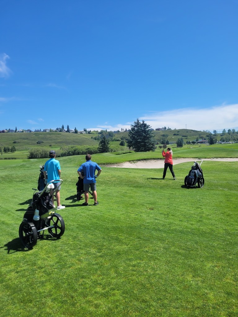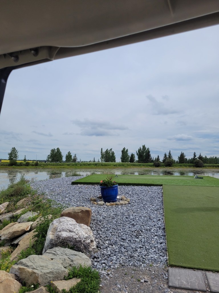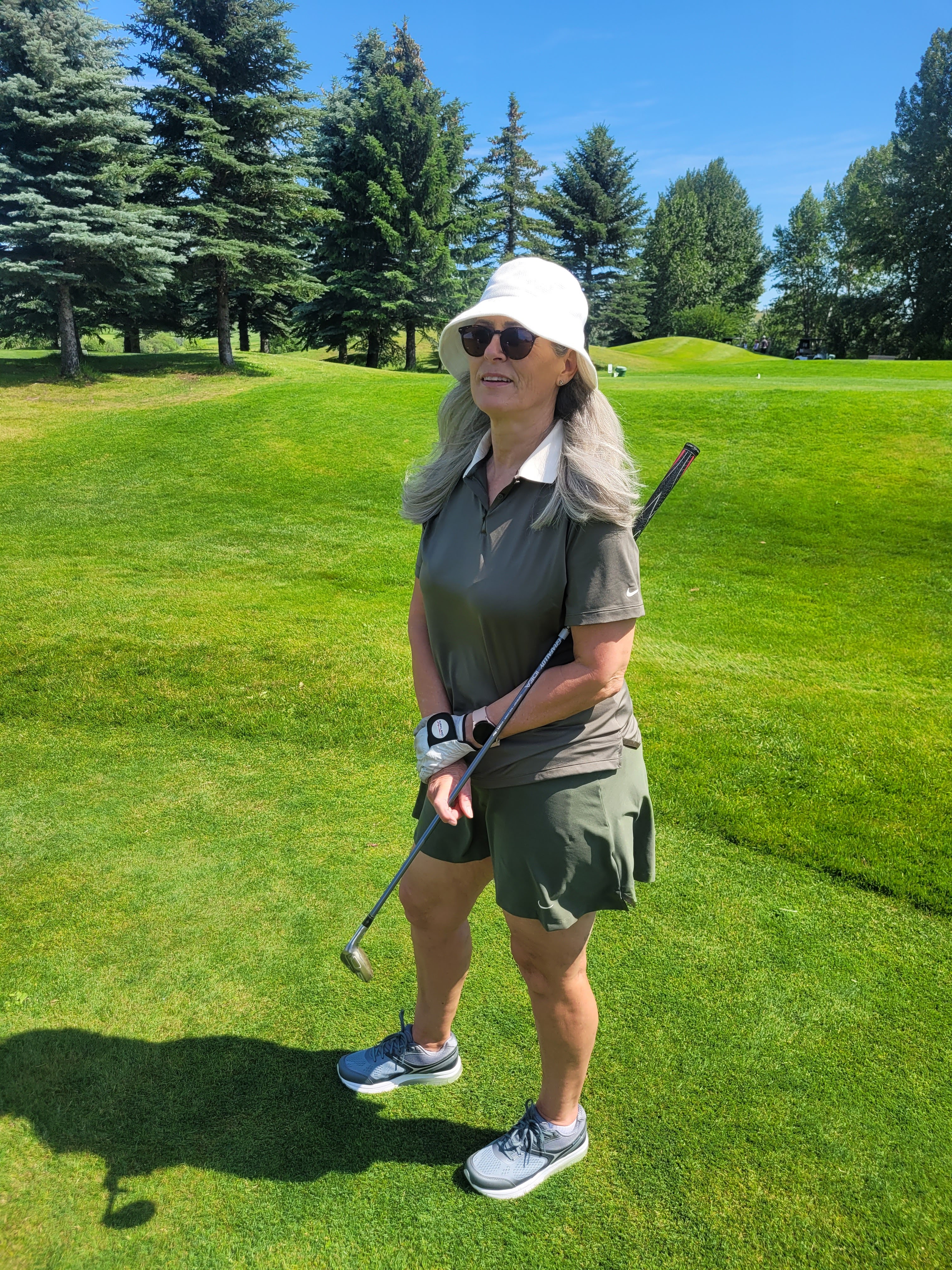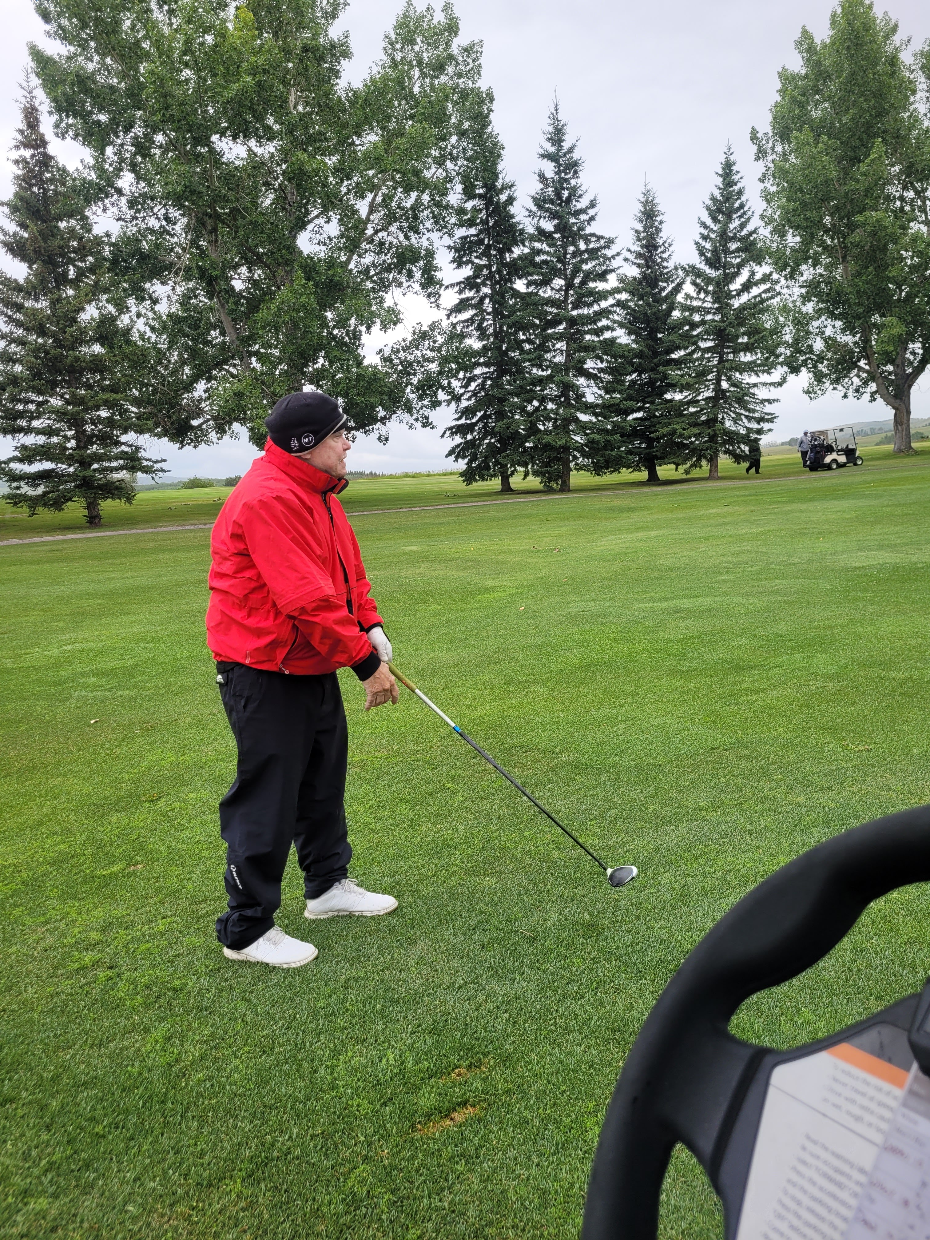 Today it is warm hitting 27 degrees which is just about perfect for golfing. We were golfing with Jeff & Wendy today at Copper Point. I have golfed here a few times but today my memories and reality seemed different. It is a gorgeous course with a wonderful set up. A mountain course but friendly enough. First drive , no warm up, screwed up, but after that the front nine was wonderful. 7 Pars and two bogies was a great start. I was driving well today. The back nine a complete different story. Still played well but would hit a 250 yard drive and run into the bush. Lost ball. Not knowing the course doesn’t help. Double bogie heaven happened on the back nine with mistakes, weird lost balls and bad luck. On one Par 5 a great drive and I was down in a gulley with 220 yards left to the green. The group in front of us was slower all day. I dropped into the valley and thought by now they should be gone. I hit the ball perfect. I drove up to the top of hill. No ! My ball landed 5 ft from the hole and they were still on the green close to the hole. Jeff and the group had a bit of conversation which I didn’t here as we were a way back. I am sure neither party could hear one another. I don’t like to do that and shouted sorry but no reaction from them. Good thing no hockey players involved.