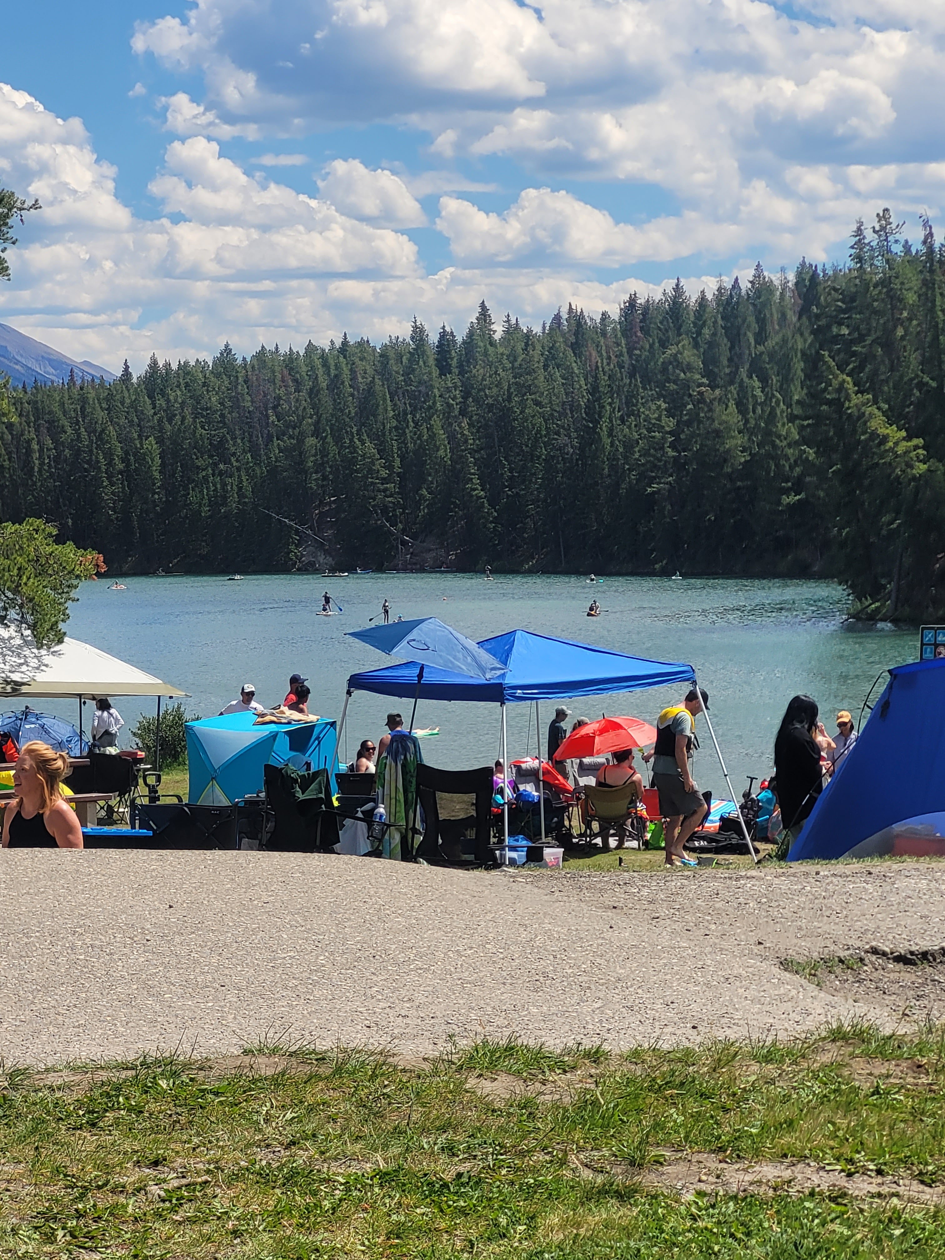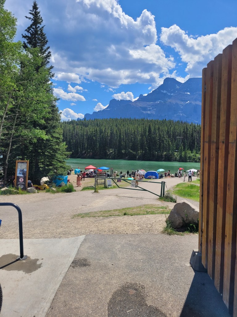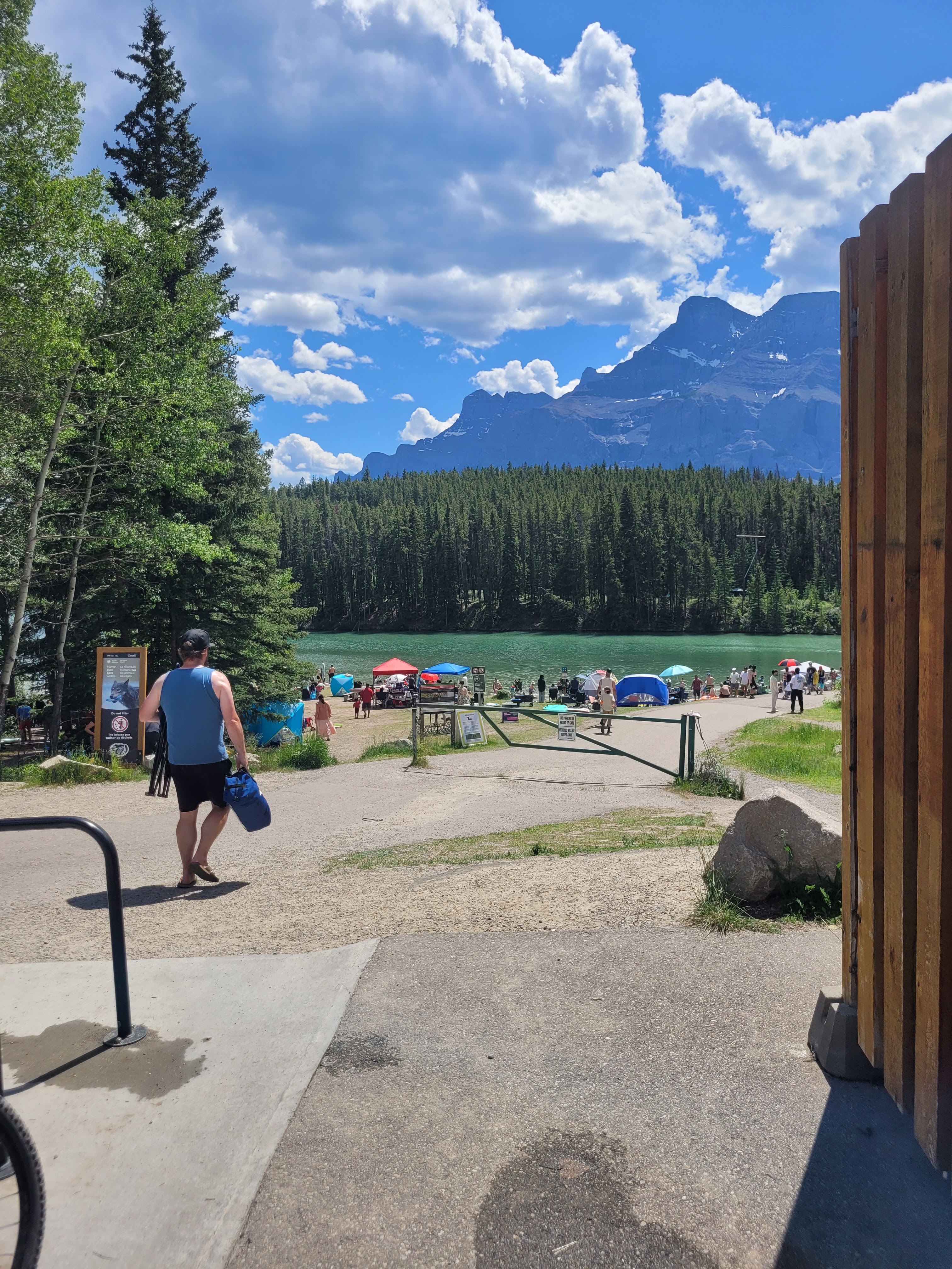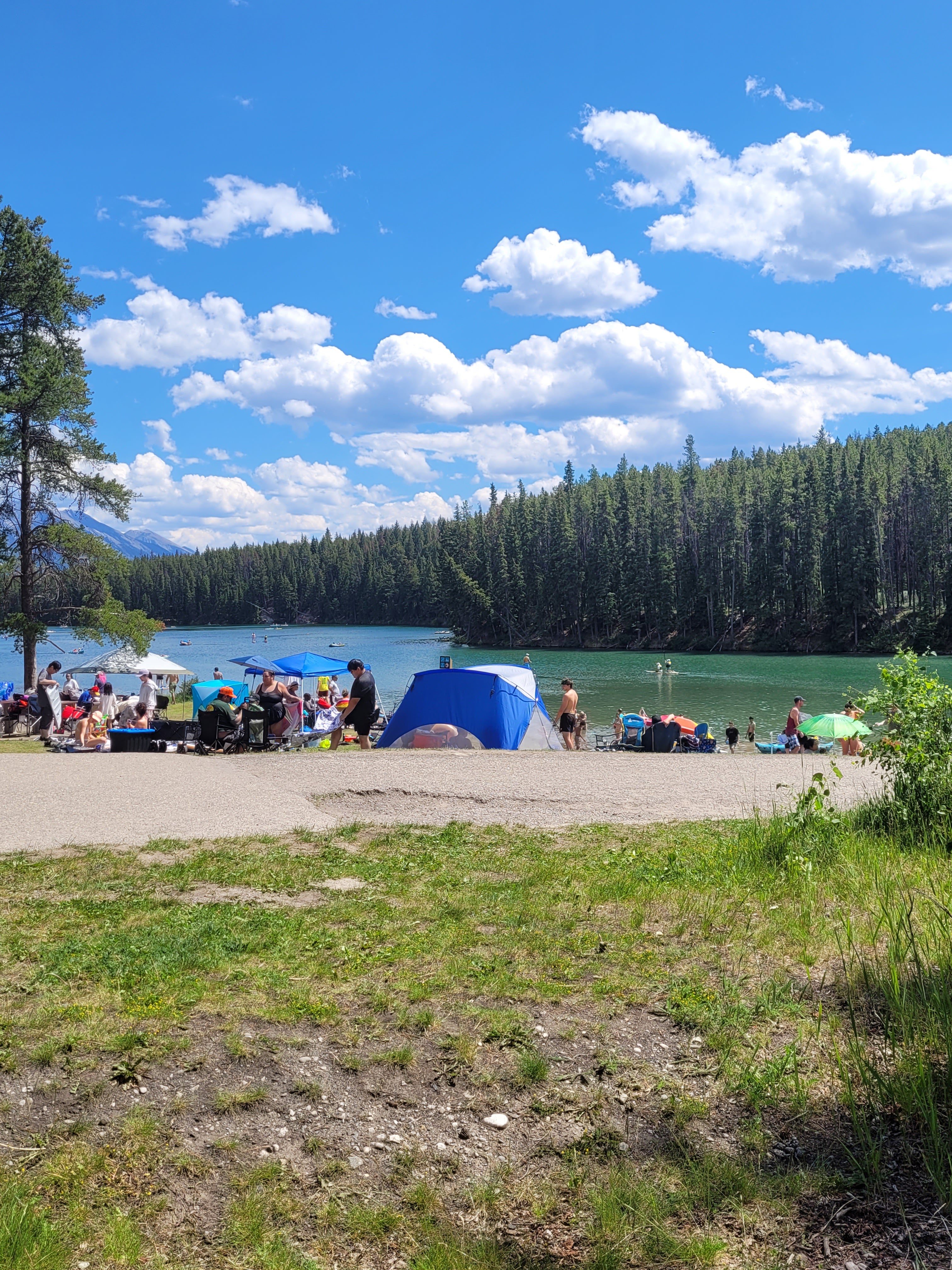 We decided on Cascade Pond just outside of Banff. On arrival, the rangers sent people up the road. The parking lot and sides of the roads were jammed with cars. So on we go on the road to Minnewanka Lake. We get about half way and see an exit to Johnson Lake. Great find as we arrive at a nice mountain lake with a beach. Cars parked miles up the road. The parking lot was full. As I circled around, we got lucky. I found a spot.
