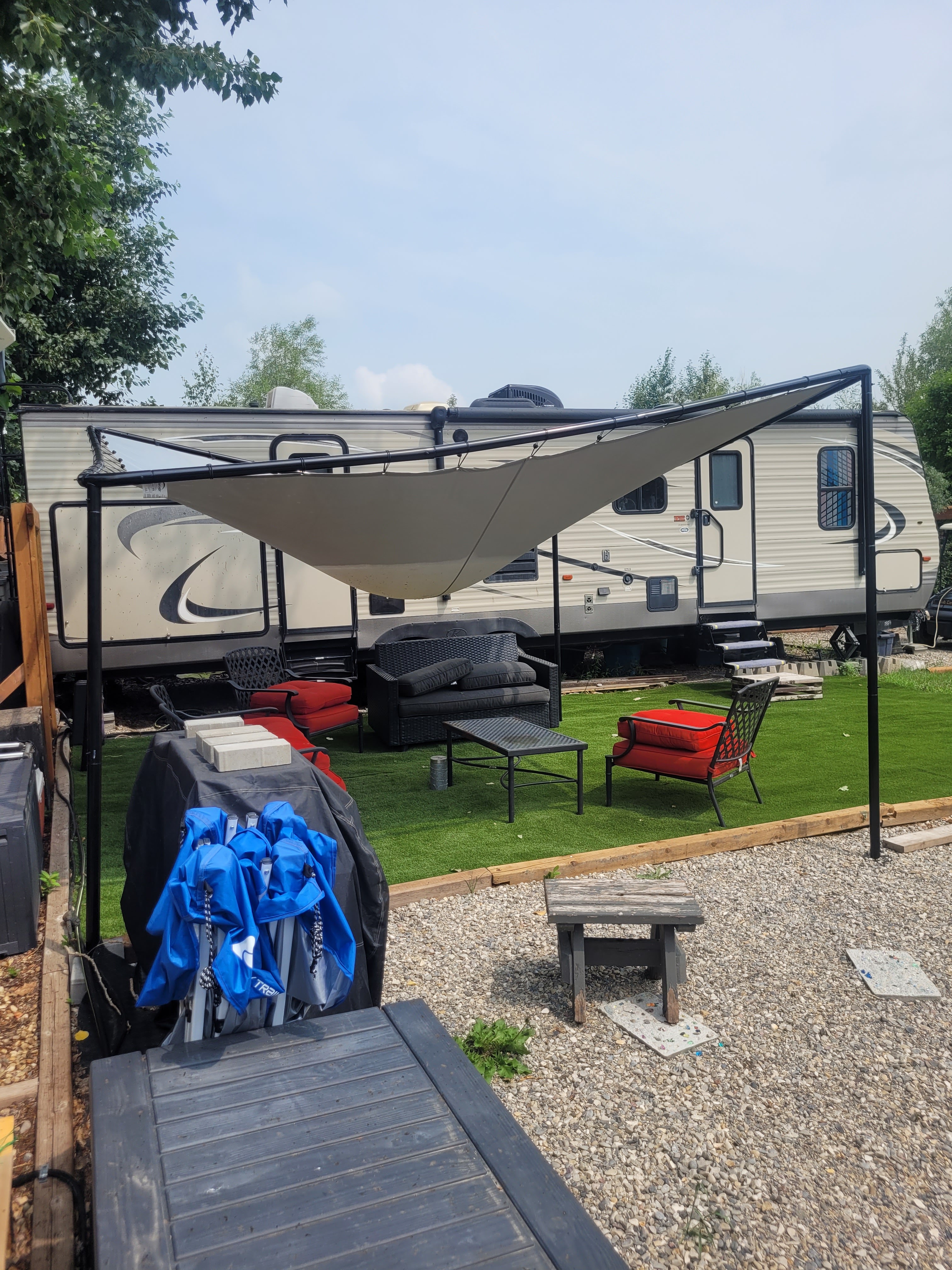 It is just so relaxing to sit in the sun and not have anything really to do. This sunshade below attaches to the awning and stops 85% of the UV rays and helps keep the unit and ourselves cool.