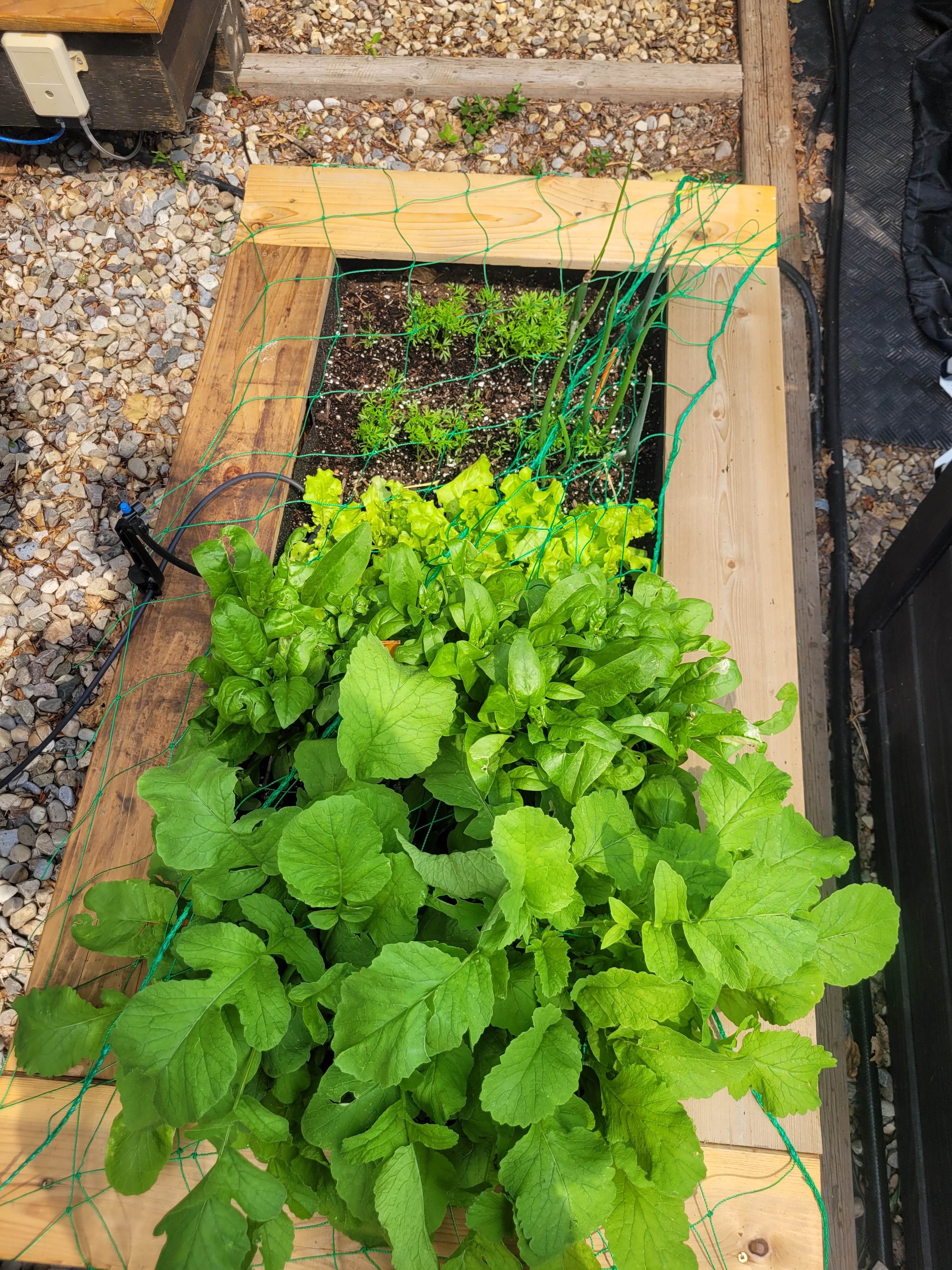 I cleaned up the plants and cut the grass. I cut more lettuce, spinach and radishes and bagged them to bring home.