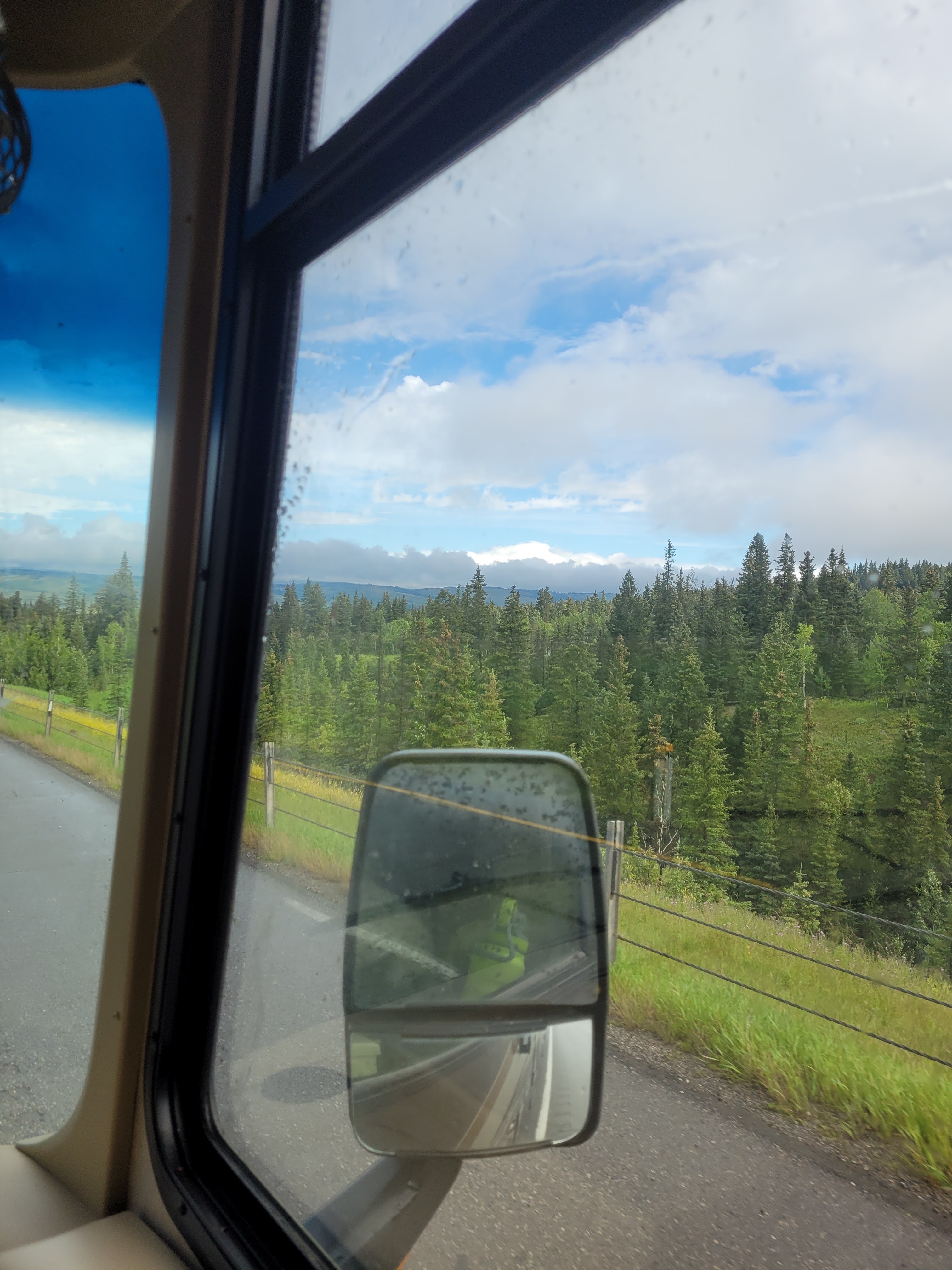 Pouring rain. Got a little wet hooking up. Very cloudy and misty. The traffic was light which was nice as we took Hwy 8. A stop at the Nakoda Casino for gas and Tim’s. I had enough gas to make it but climbing hills eats gas fast.