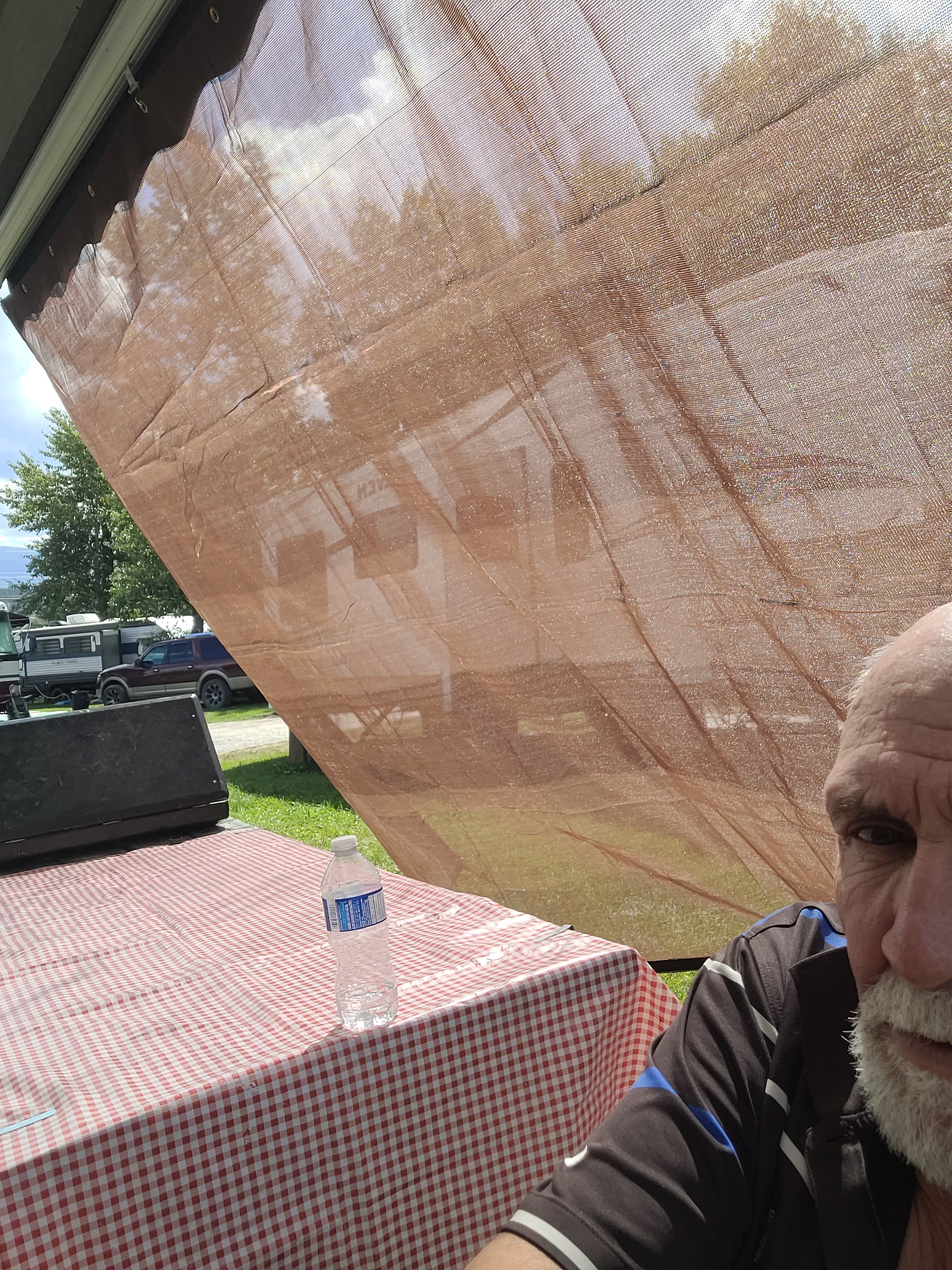We got all set up leveled. parked at ready. HOT outside so I put up my sun screen which blocks 80 percent of the rays. Just makes the sun not feel so hot.