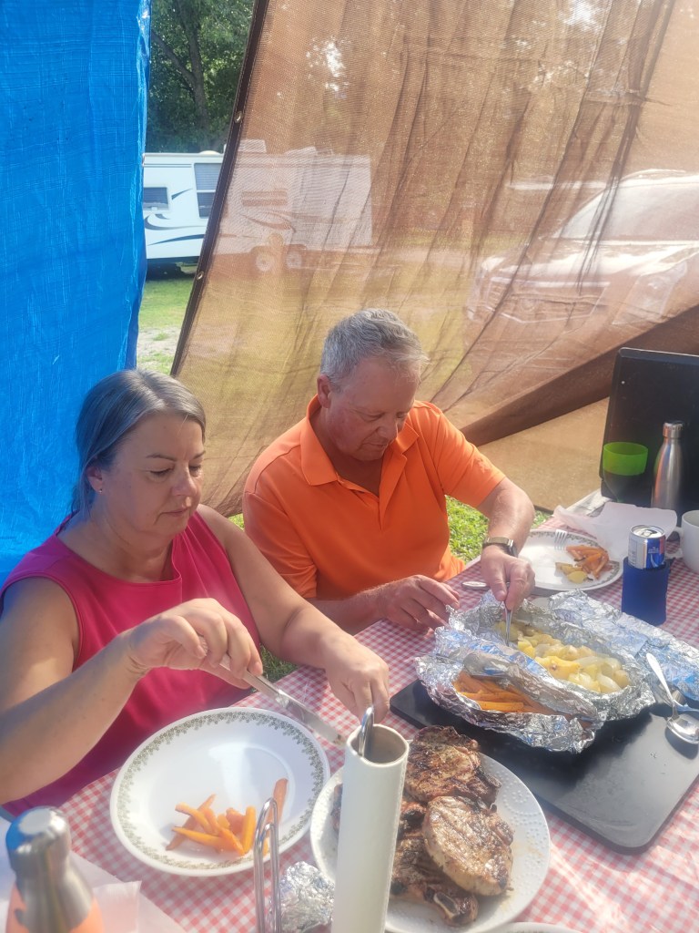 We came back to our campsite and we had made supper for everyone. Roast potatoes, carrots and 1 inch thick porkchops. I just missed having the gravy !! Everything turned out good. I like the potatoes to be a little more crusty but by adding olive oil with butter on them it is much harder to achieve. I normally just use butter and stick free aluminum. The meal was good.