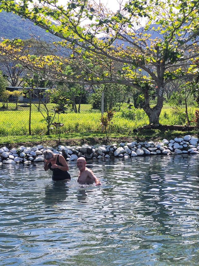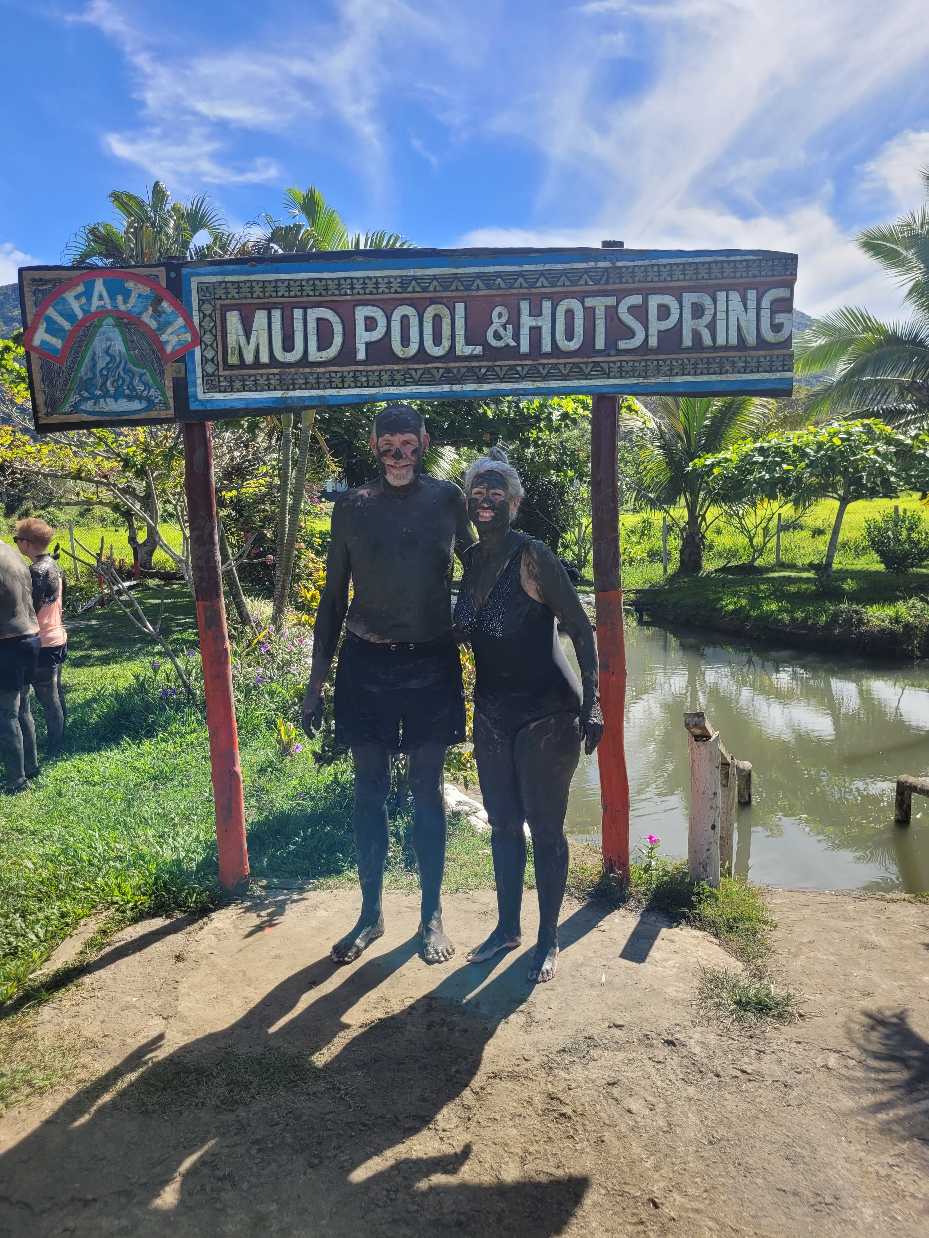 Mudding each other was a blast. We got covered. I had thought we would be in a mud pool but it turned out we were rubbing mud out of pails from a mud bog near us. Then we head to a drying station. It felt cool with the mud drying and shrinking. Our skin looks like an elephant. Then we head to a progression of hot pools for a rinse. Tricky maneuvering them with slippery rocks and bottoms. It was a cool adventure. They offered massages after the mud baths. Jackie had a long massage and foot massage as a birthday gift from Alan & MaryAnn. We ended up being the last one to the bus. Awesome experience.