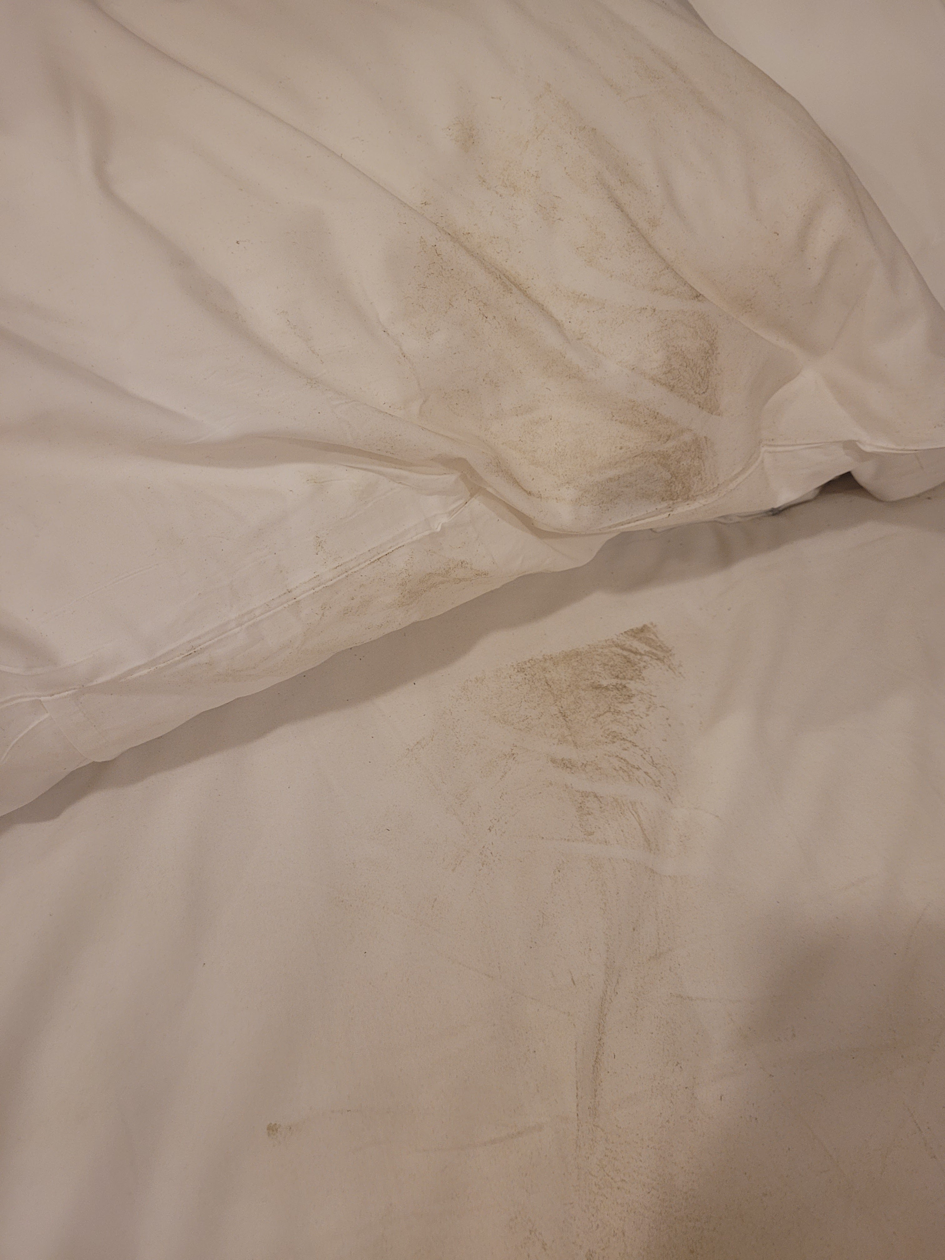 I woke up and on my side of the bed the sheets were covered in mud. Wow a long shower didn’t work to well. Even my pillow was brown. Jackie’s side not so much.