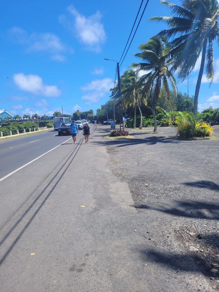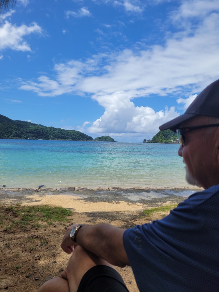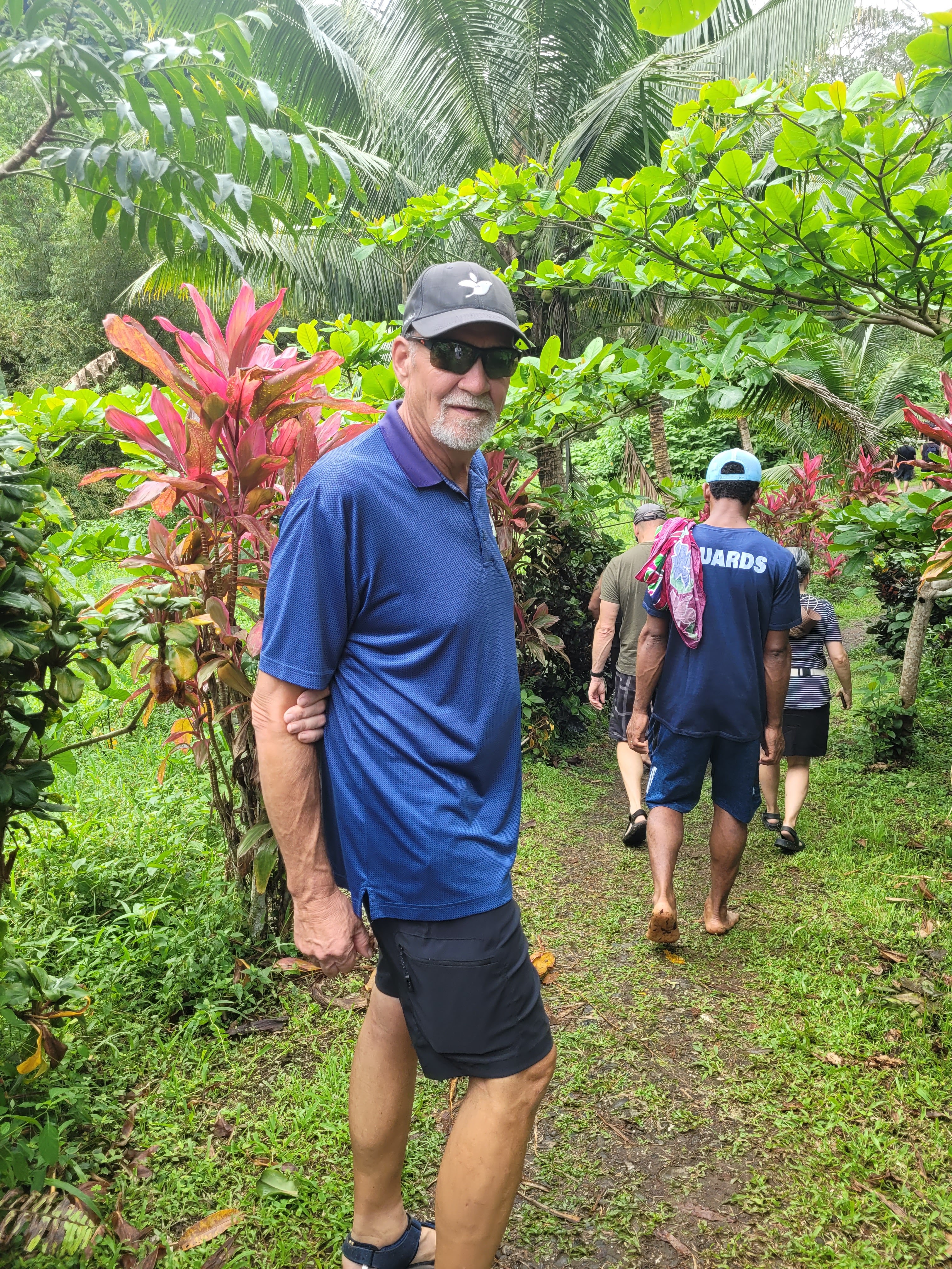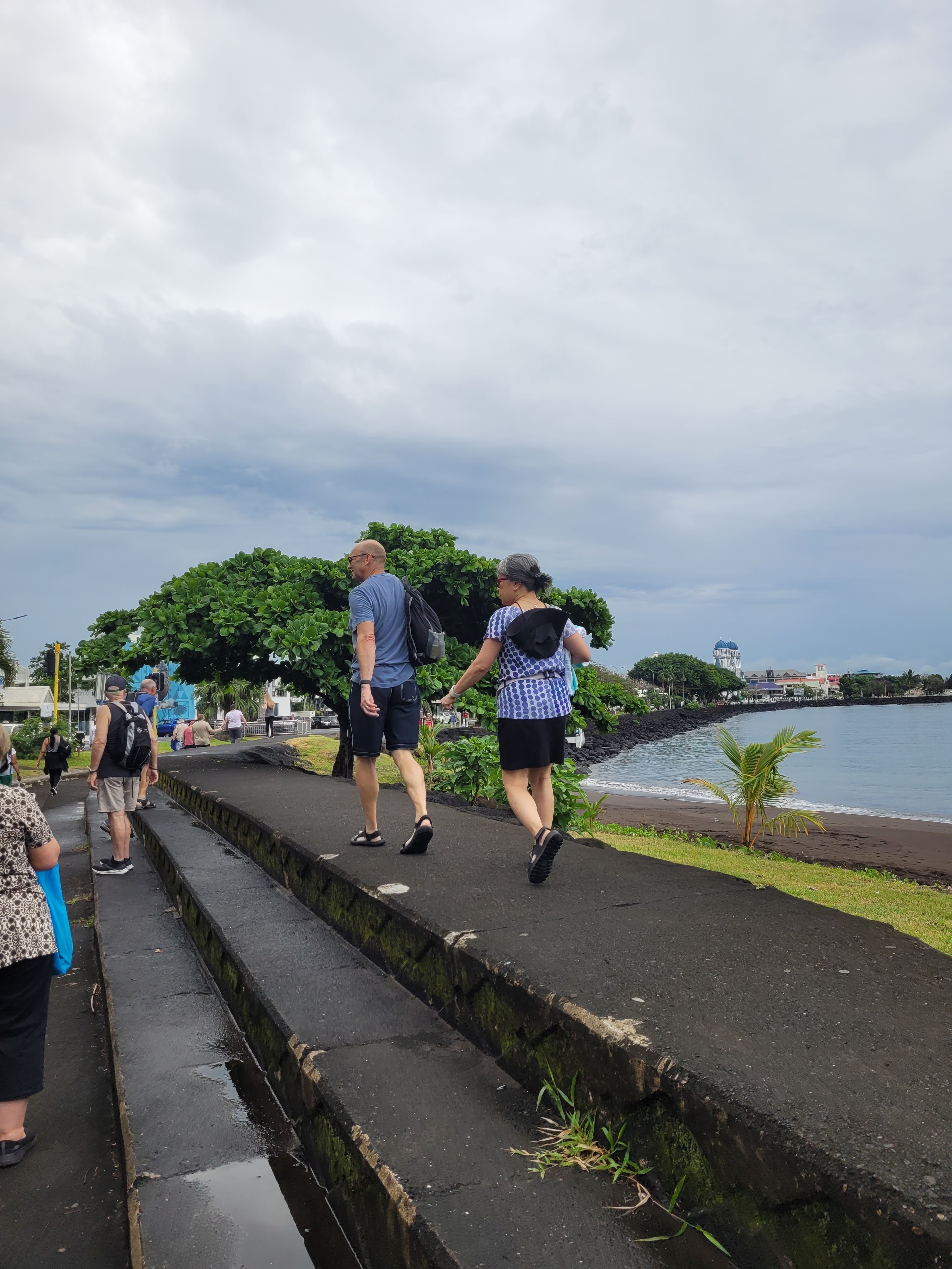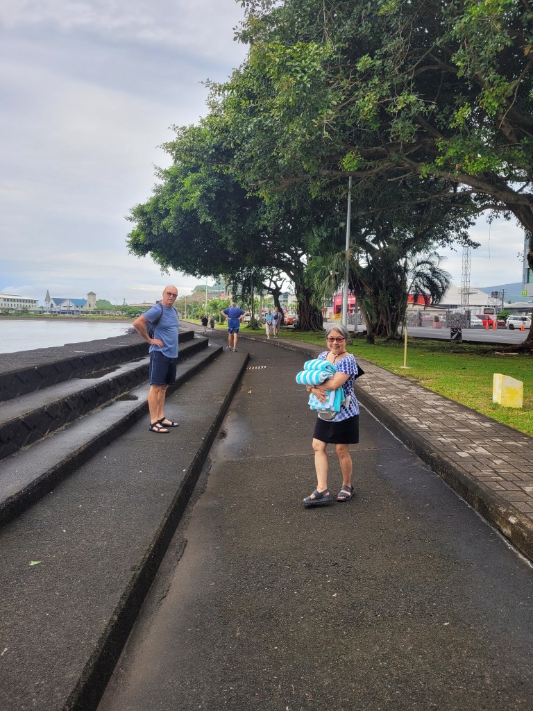Jackie bought a wonderful cover up from a local vendor with the Polynesian theme. They were laughing as large butts is what Samoa men want and like. The ladies were having a lot of fun with it. We walked to a snorkel beach. Sand and more sand. Fish and coral a ways out but without a mask not the perfect situation. The four of us are getting major steps in to combat the food and drinks.
