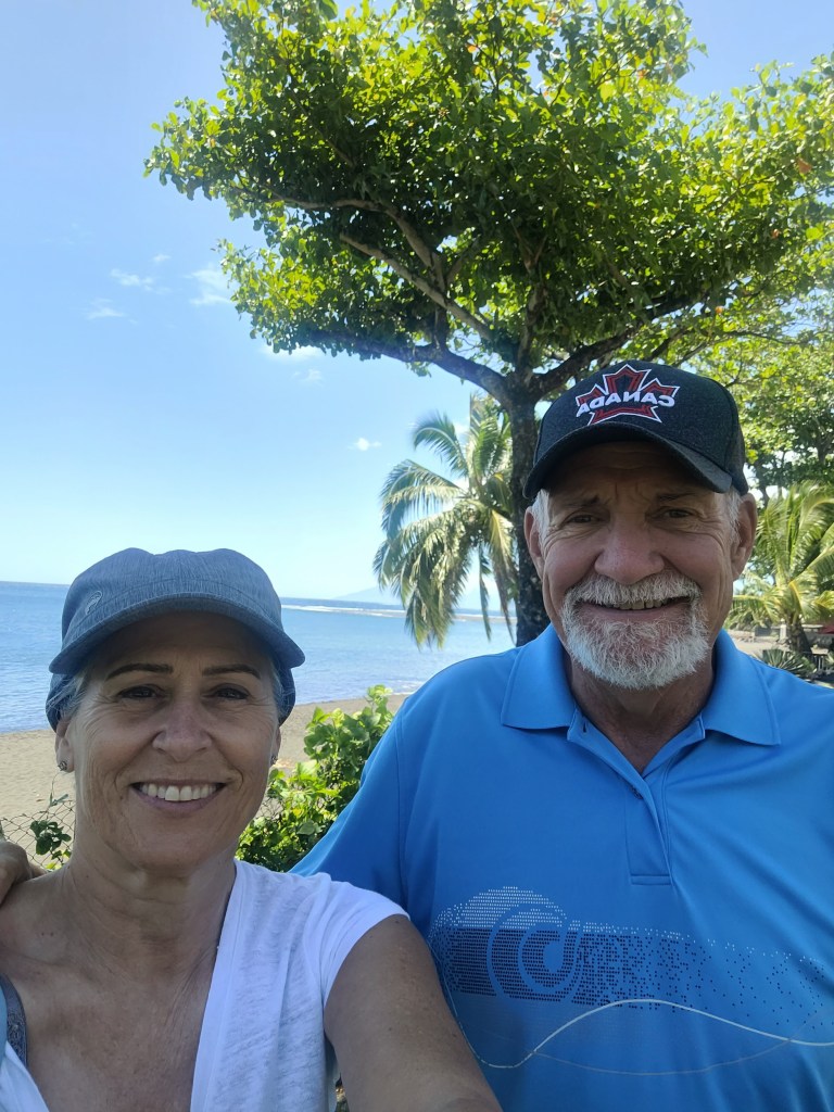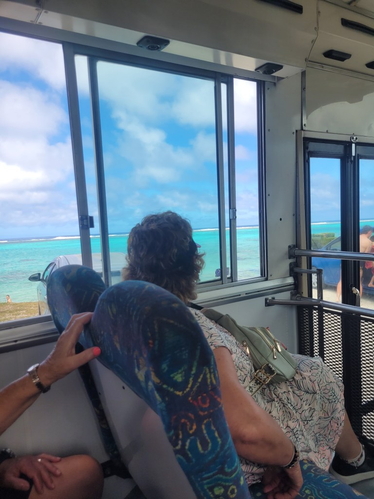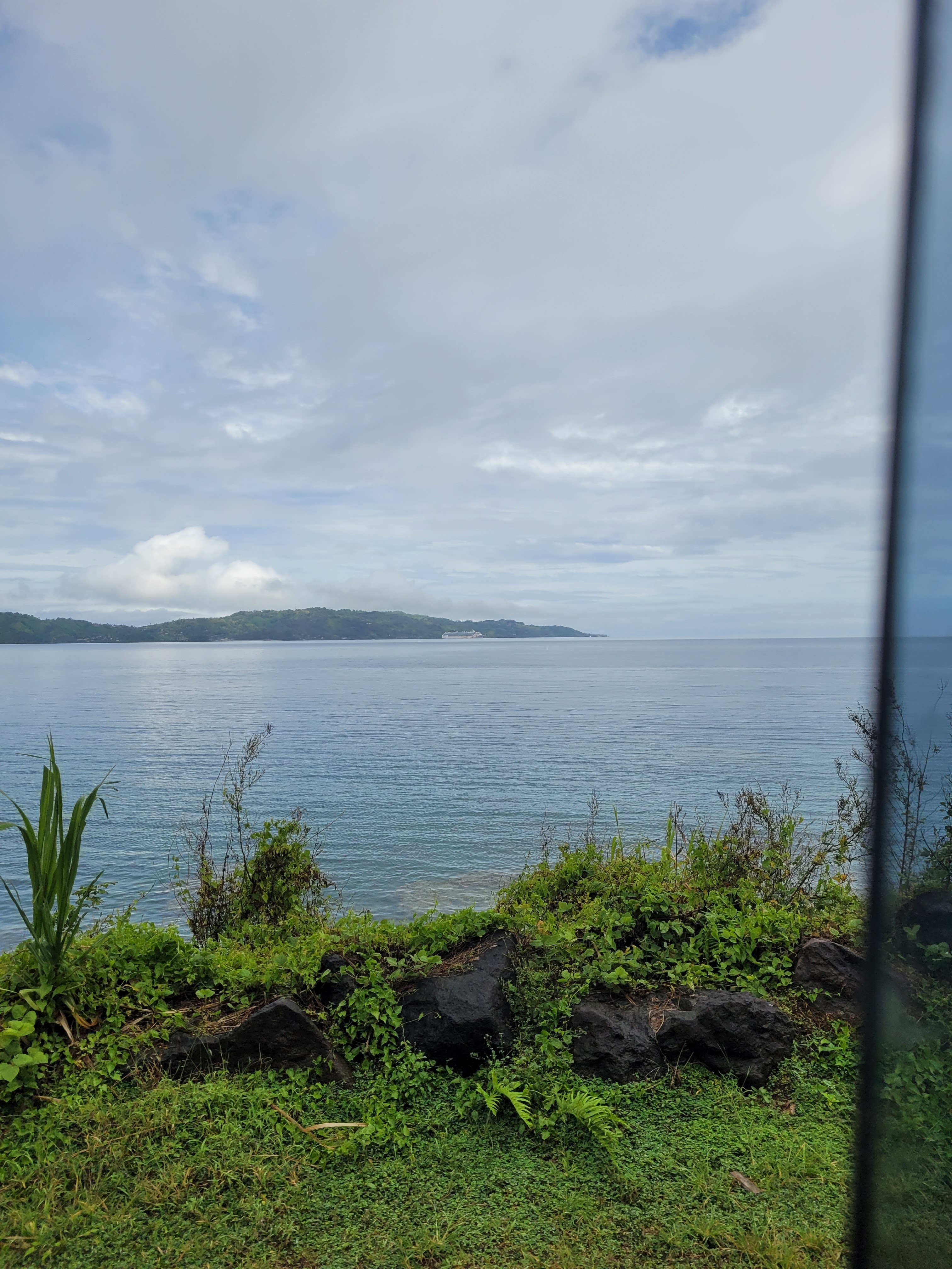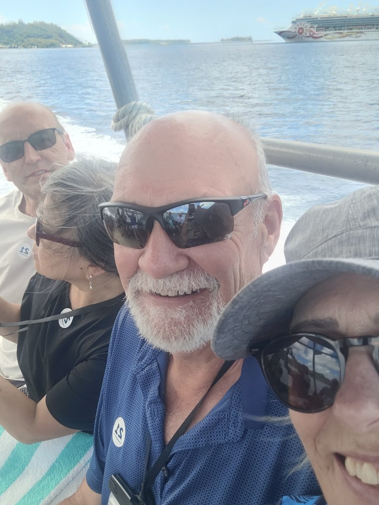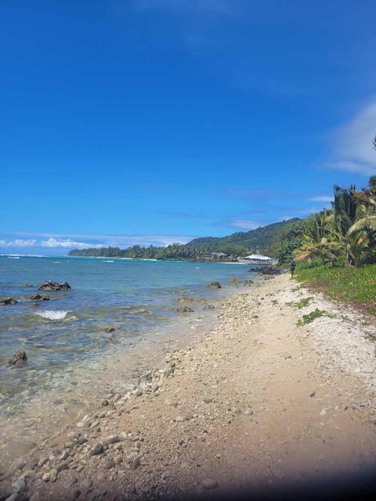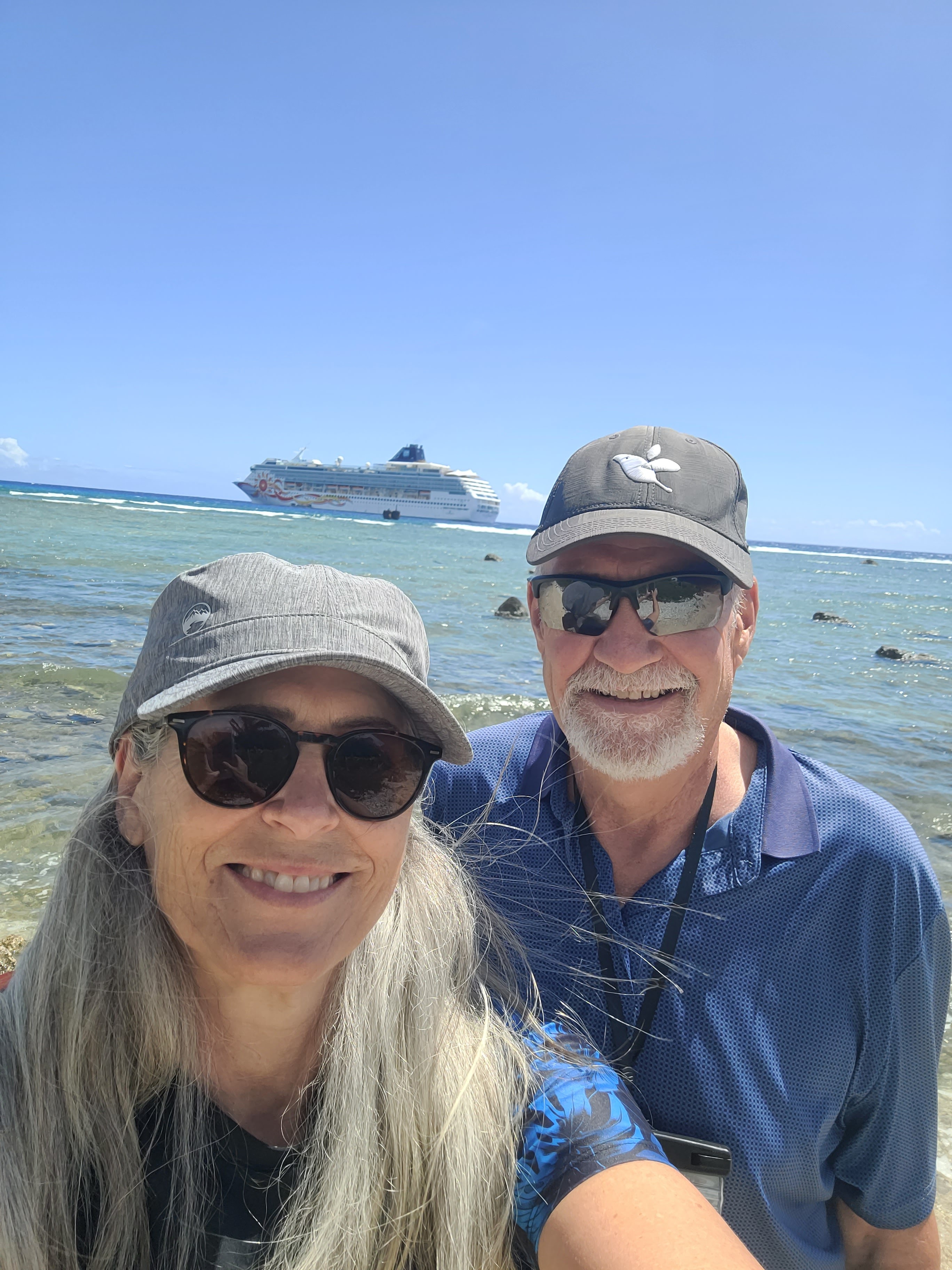 Jackie bought a wonderful cover up from a local vendor with the Polynesian theme. They were laughing as large butts is what Samoa men want and like. The ladies were having a lot of fun with it. We walked to a snorkel beach. Sand and more sand. Fish and coral a ways out but without a mask not the perfect situation. The four of us are getting major steps in to combat the food and drinks.