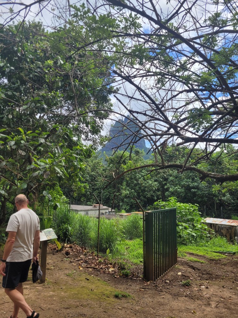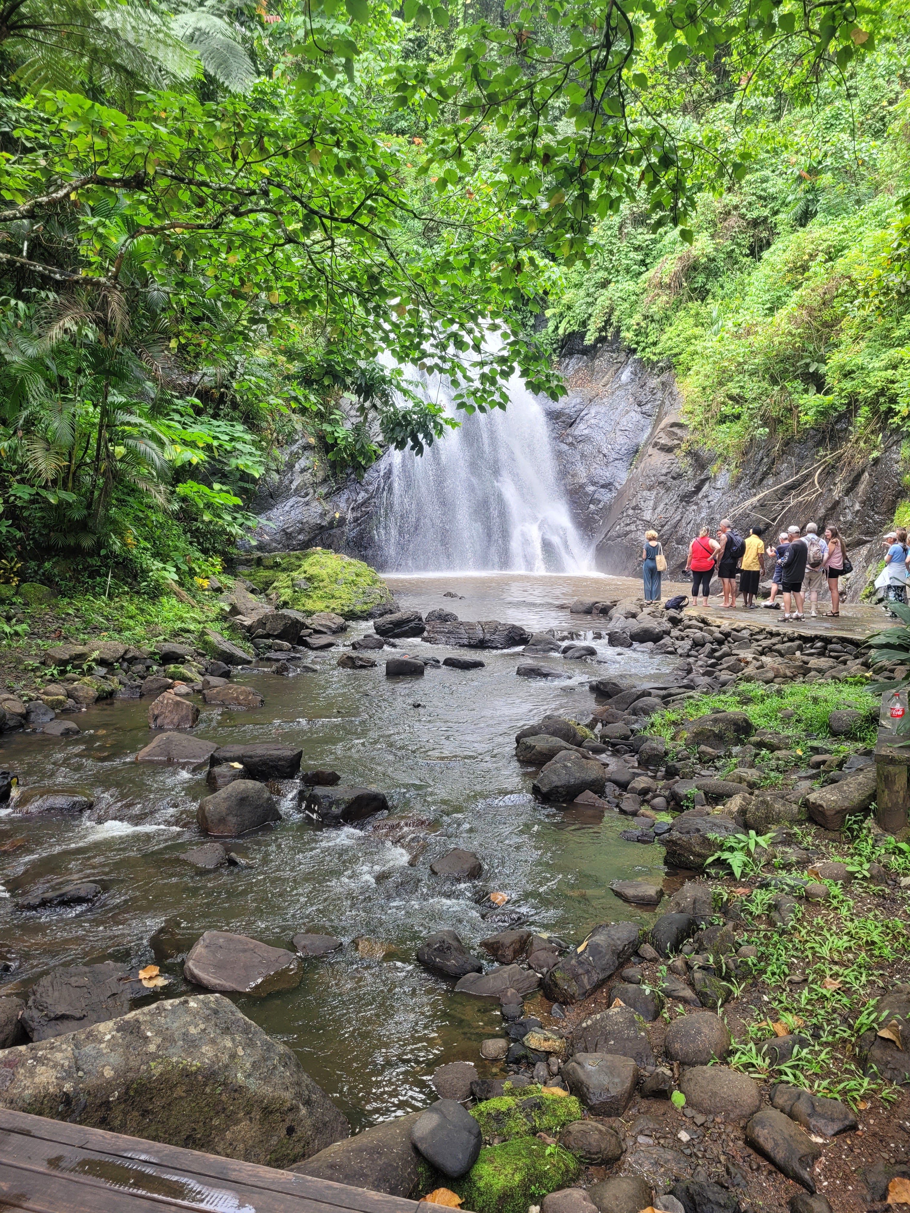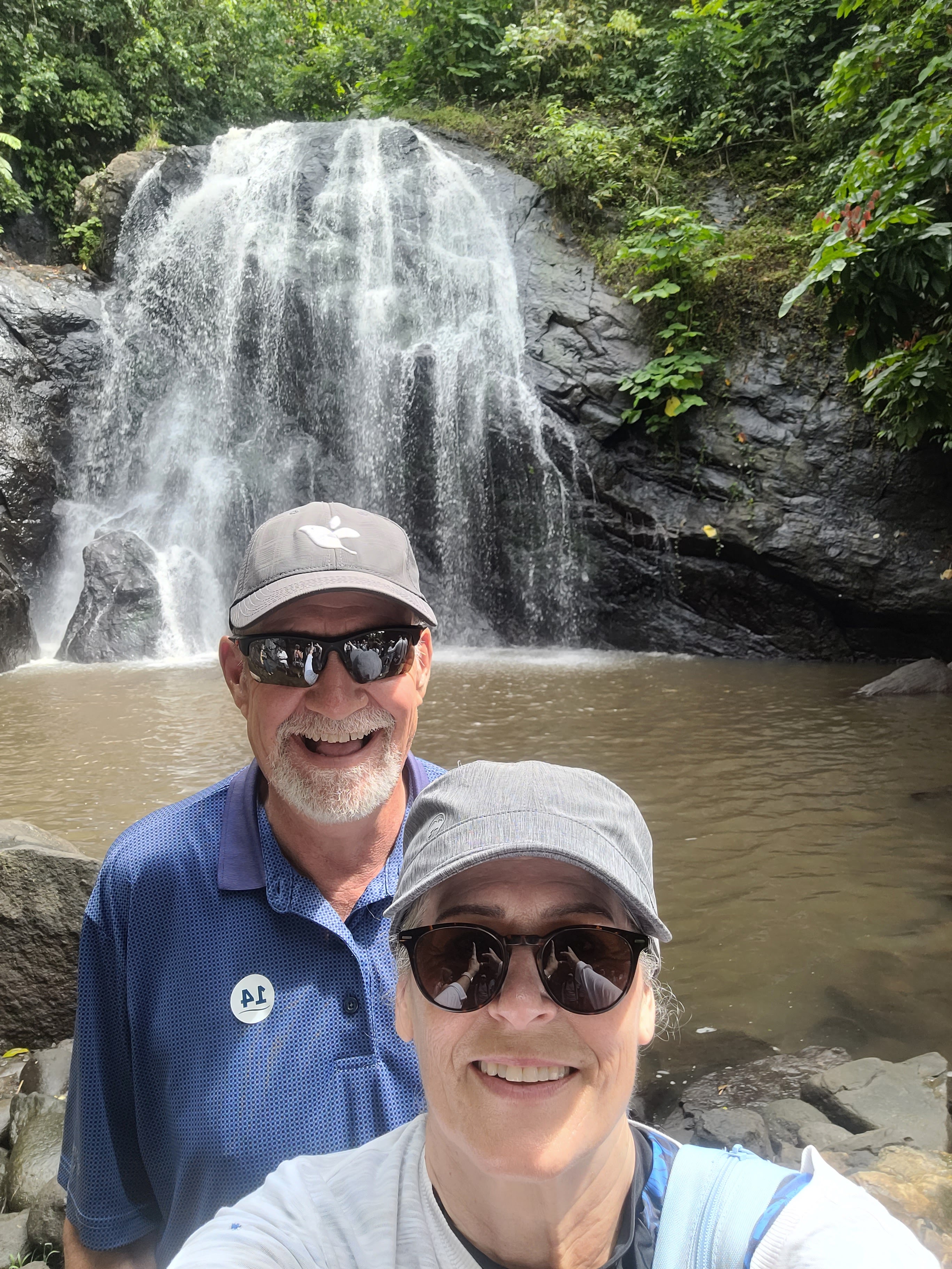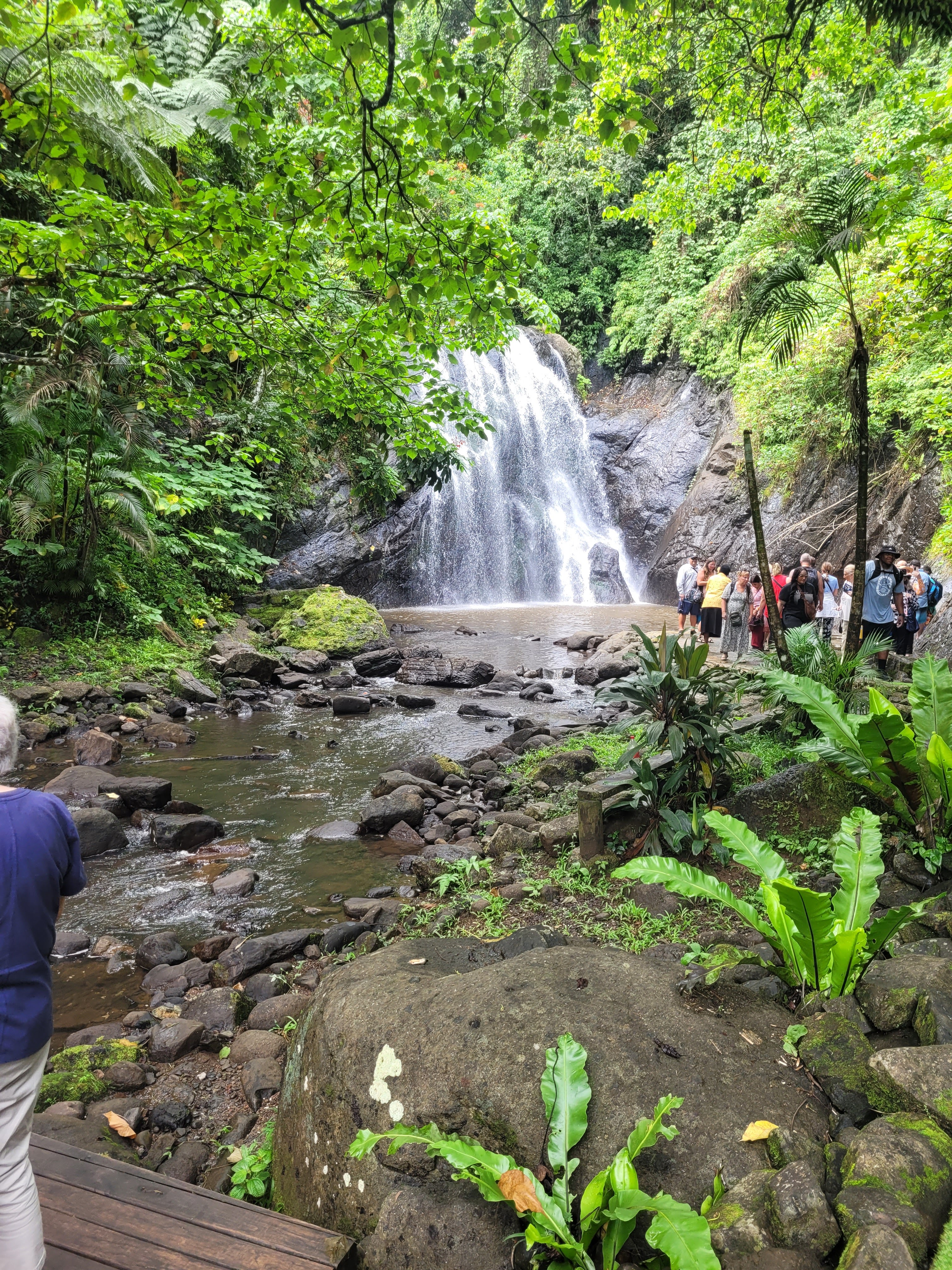 This is our first day with overcast and slight drizzle but warming to 25 degrees out. Turns out we had showers or rain for at least half of the day. It made our tour even better adding to the experience. Luckily the ship handed out a strong Deet as we were going deep into the forest. We had a culture tour booked but on the tender a cruise staff excursion member helped us change to the rain forest walk and waterfall. The guy a very handsome Brazilian helped our girls out. The beauty of this place is unmatched. As we waited for our bus we walked a bit into town. We saw at least three skinny skinny dogs. Alan bought a couple of cans of tuna and gave it to them.