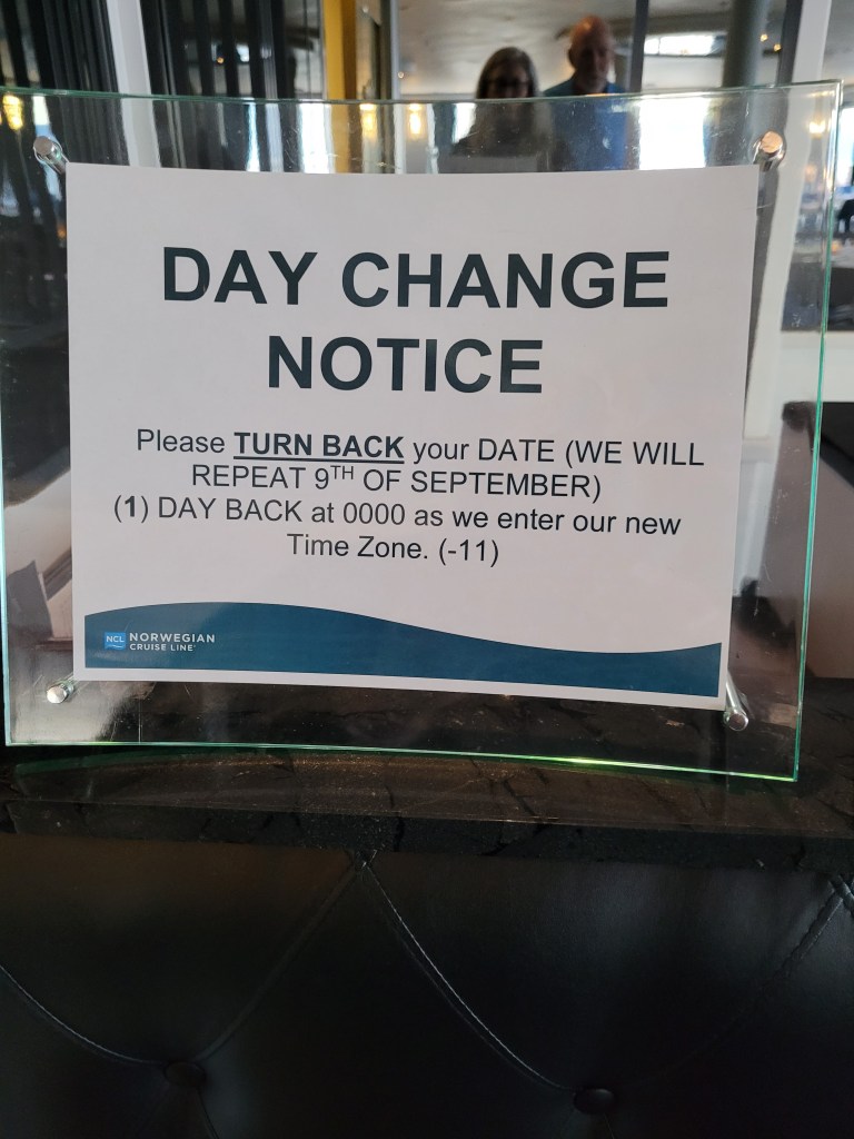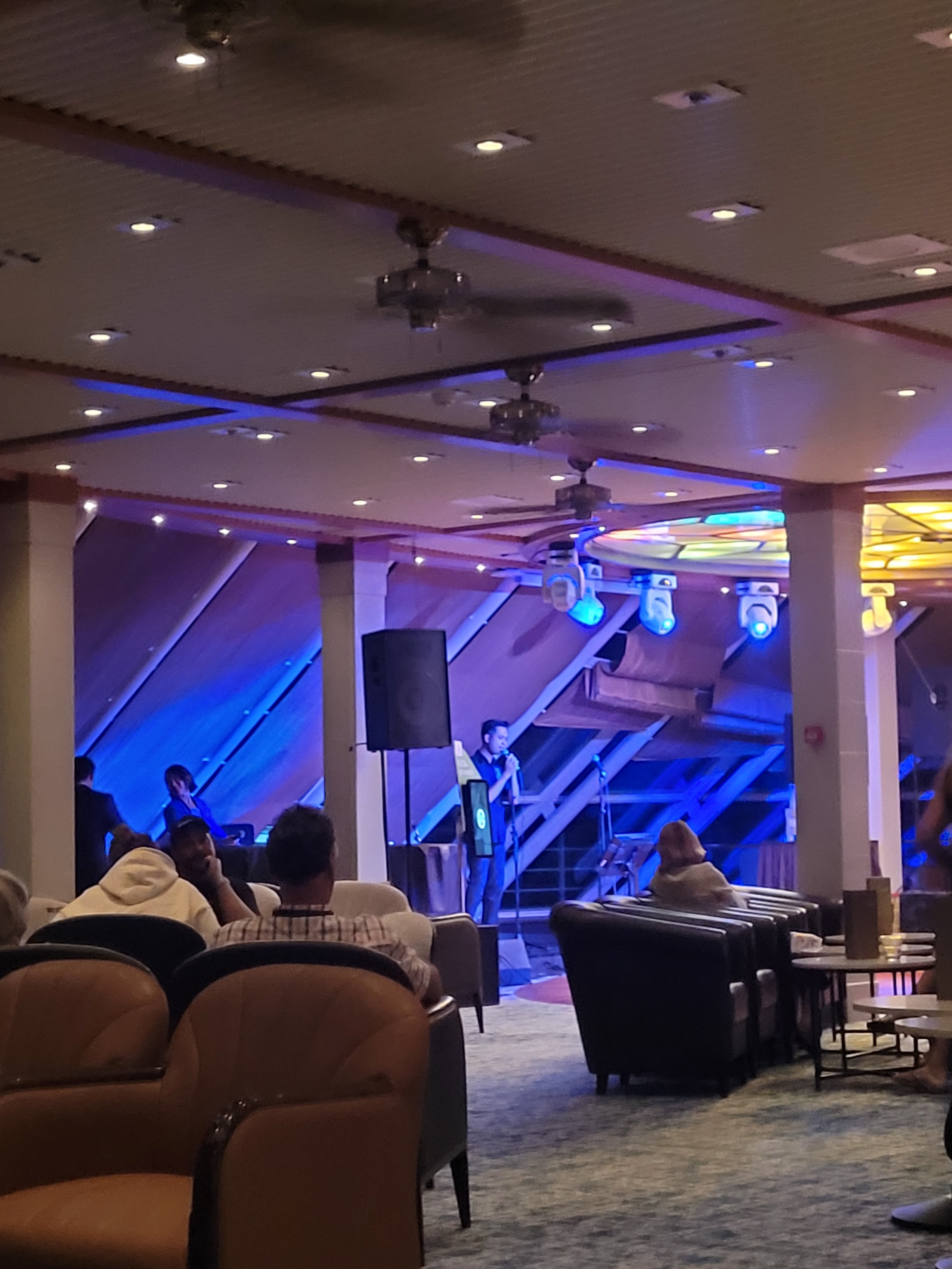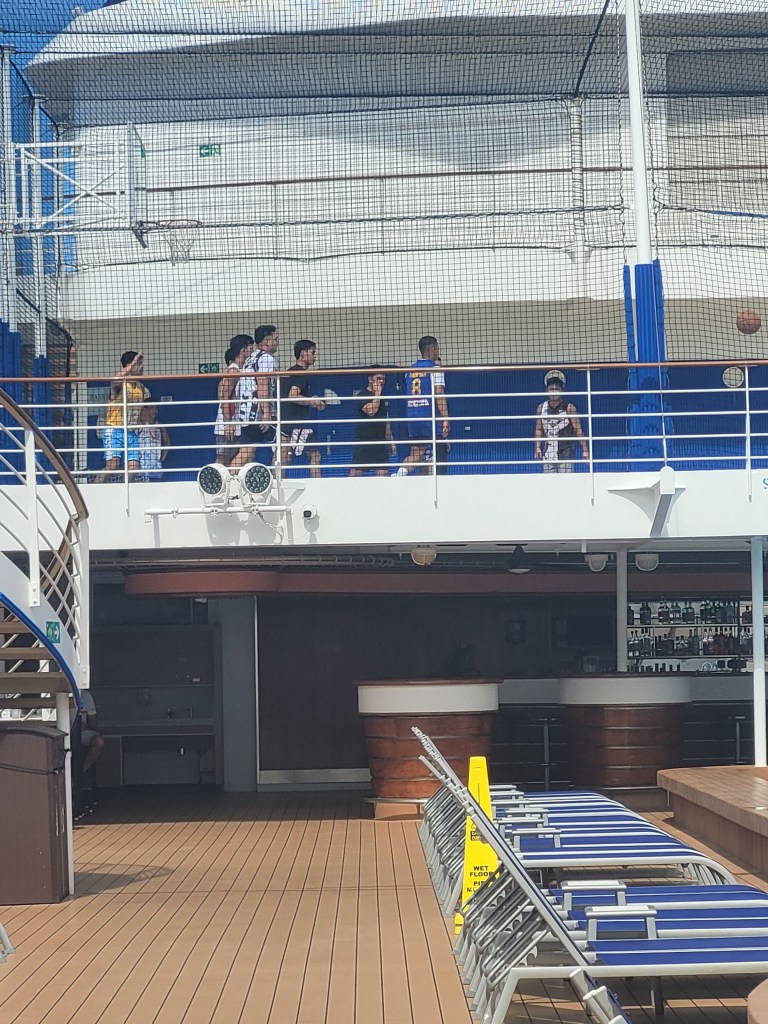 A at sea day and a cloudy rainy day so no sun tanning. Jackie and I were sitting near the pool when I see chairs being blown everywhere on the upper deck. People are scattering everywhere as gusts of wind and heavy rain happen. Two young staff members on the top deck picks up chair and is hurled to the deck with the wind and he hits his head hard. His buddy tells at him to move and does the exact same thing. They run for shelter while holding his head.