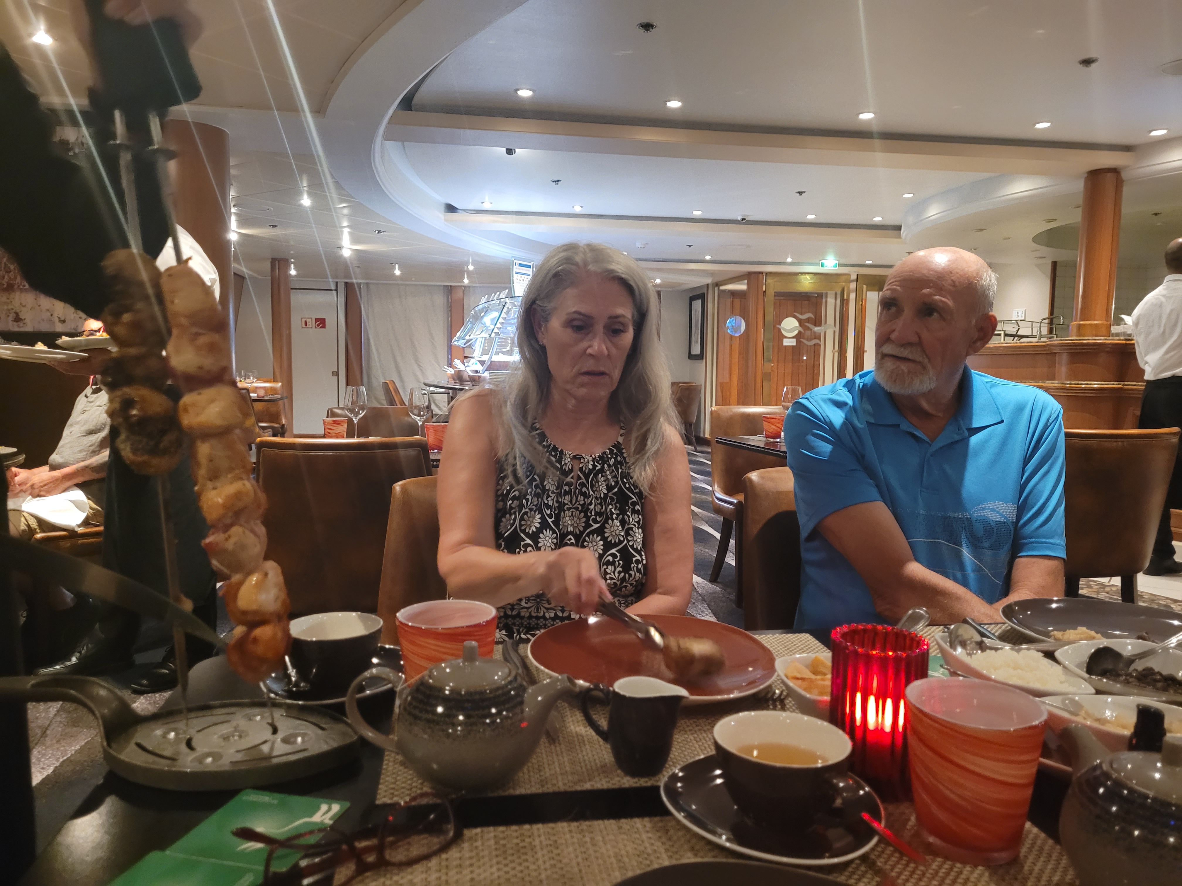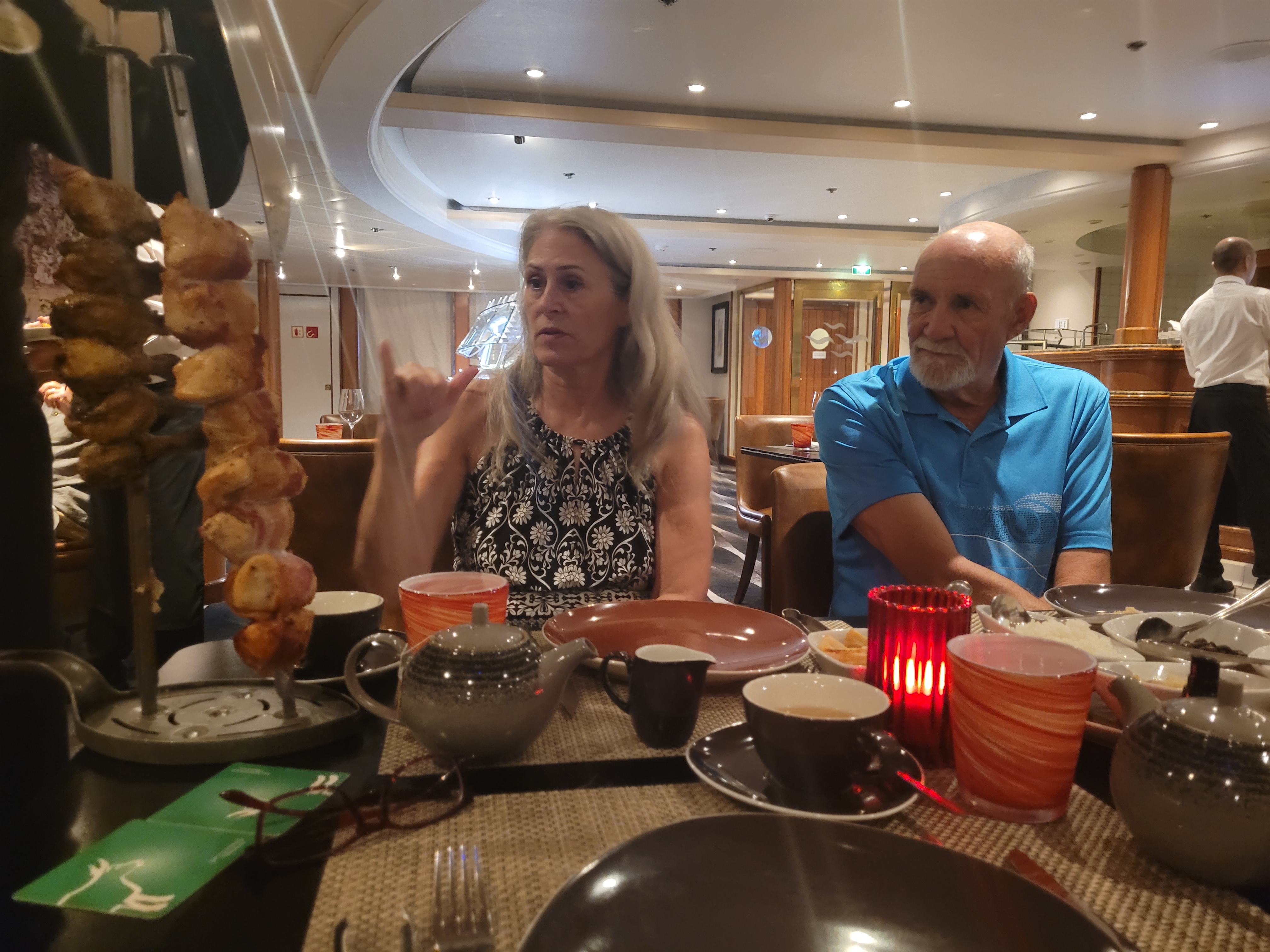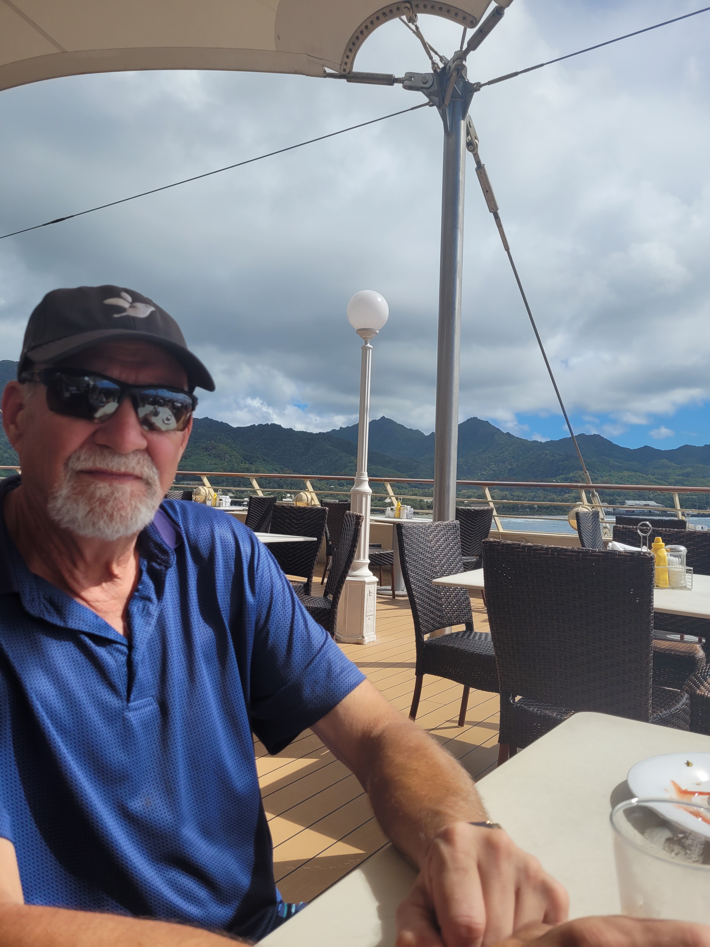 Easy boarding the ship after we figure out the system for seating and lining up to board. We find Alan & MaryAnn already eating on the back deck. I miss the Princess App.