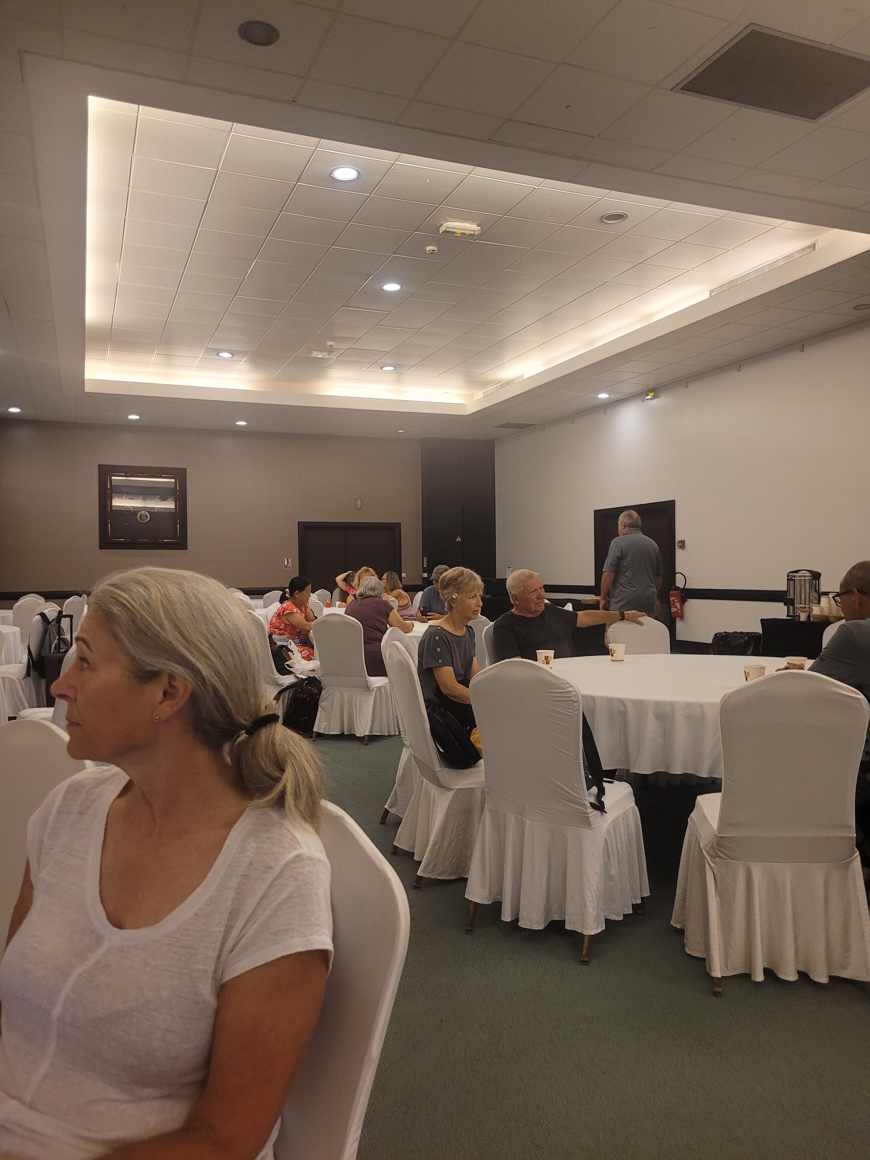 I had a late note of an event that happened this morning at breakfast. Ironic that it is a older over weight lady with the possible name Karen attempted to come thru the doors from the pool which are heavier. She struggles and grunts and gets in to find no coffee as everything had been put away. Another huge grunt and slow spin and attempts to to struggle with the door again. A funny Karen moment.