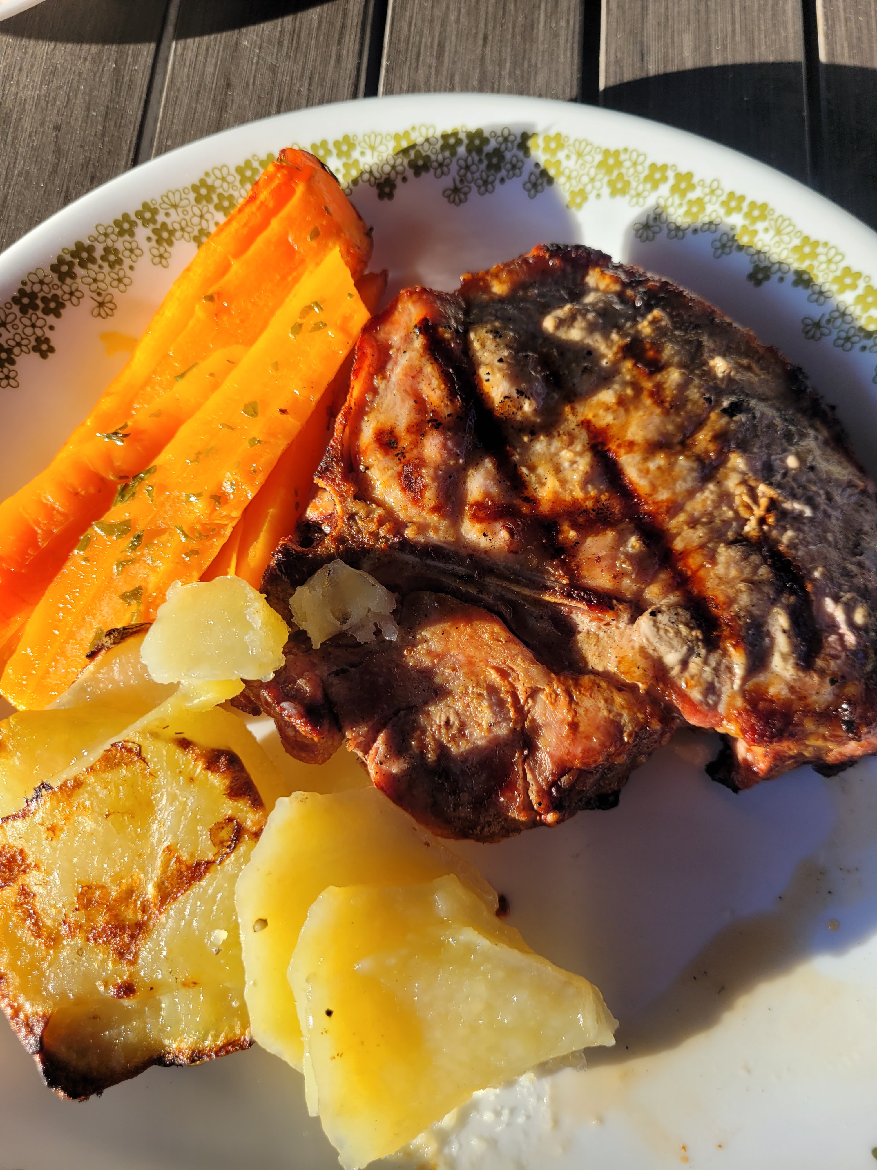 I love sitting outside eating in the gazebo. I made roasted potatoes, BBQ’d 1 in thick pork chops and fresh picked ( out of our garden ) carrots along with a salad with fresh lettuce out of the garden.