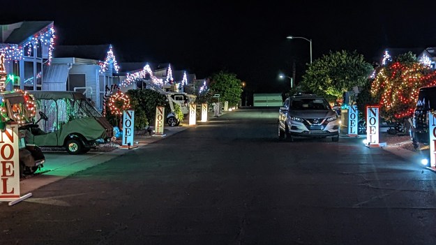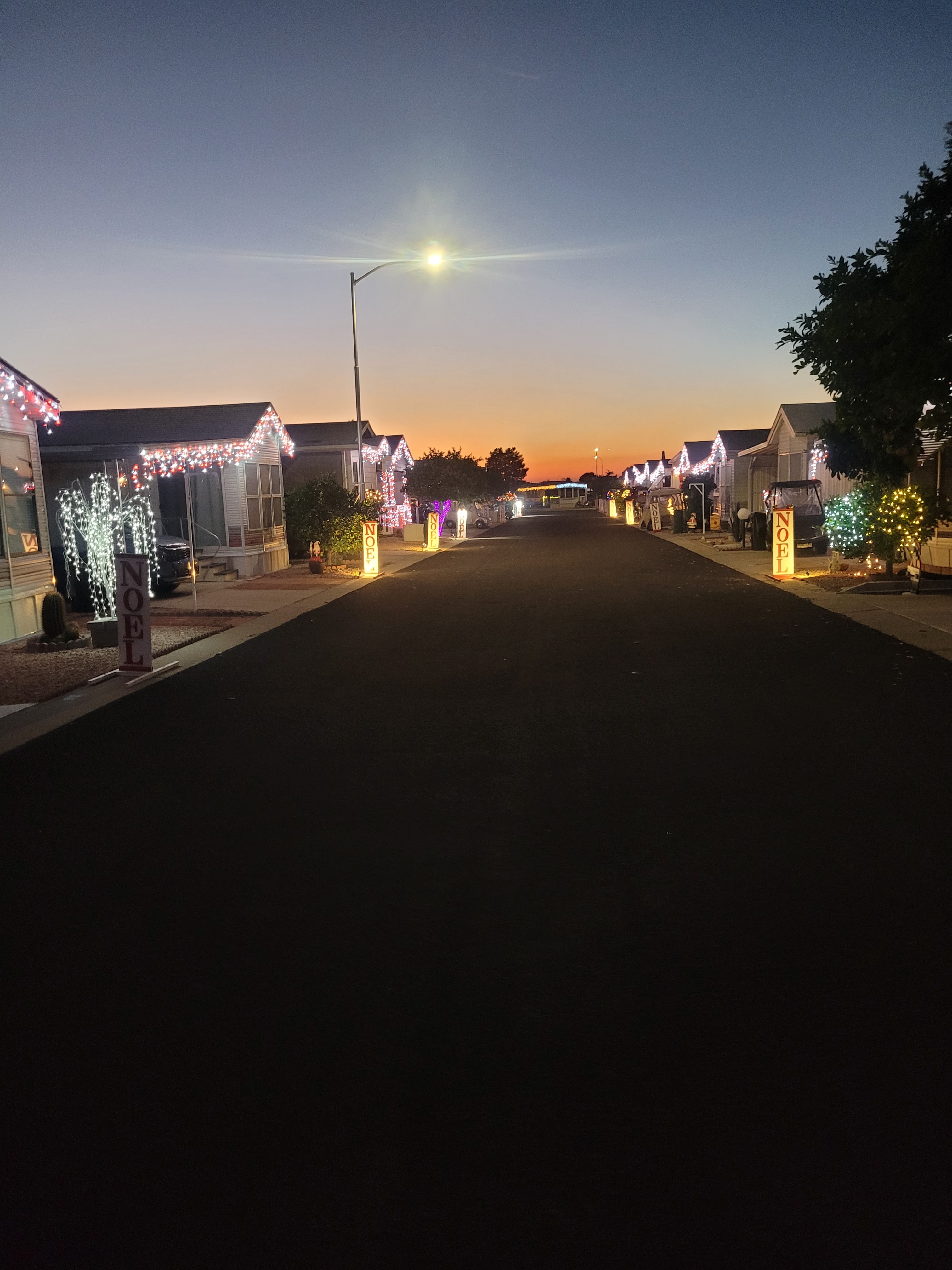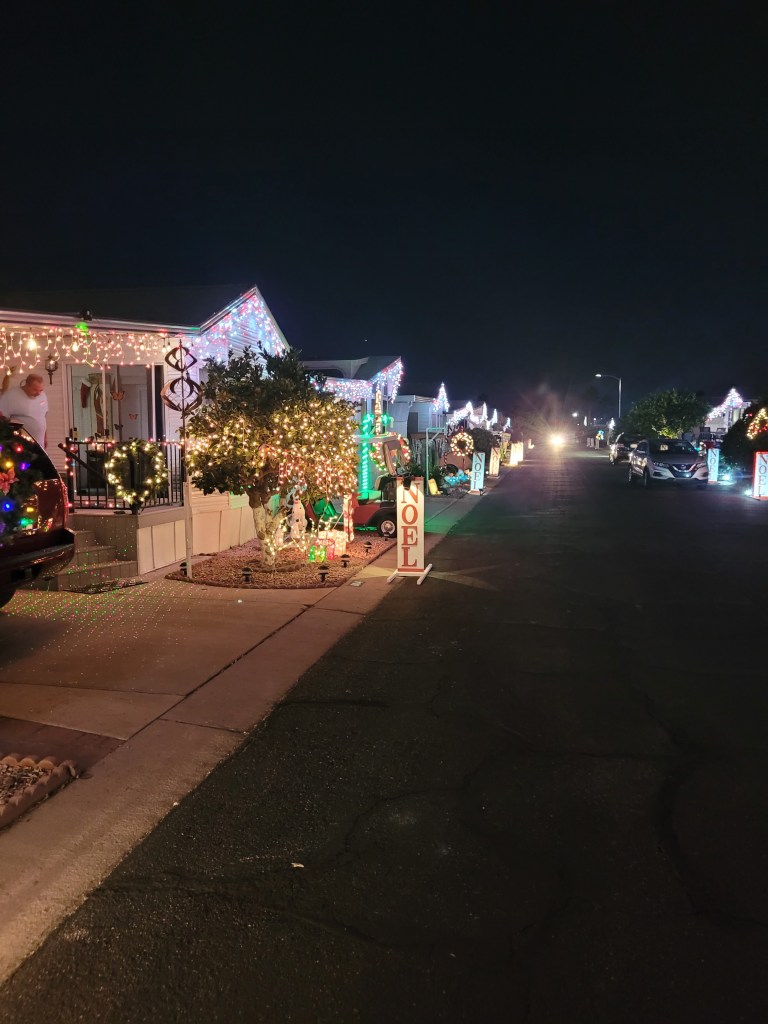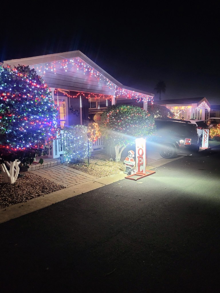 I installed the street Noel sign. I had to use a cube so the Psalm tree lights are now in unison with our Noel signs. I will see how many homes we have lite tonight.