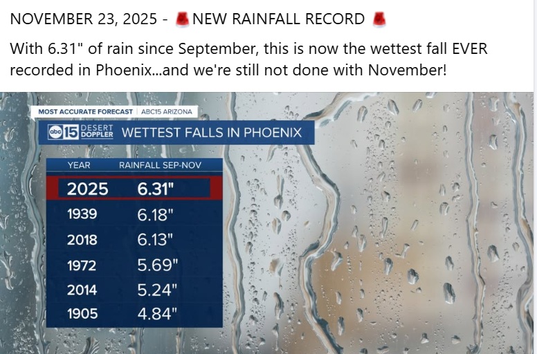 We did it. We are officially the wettest fall in Phoenix EVER ! Funny thing is the temperatures have been nice and warm and not much wind,