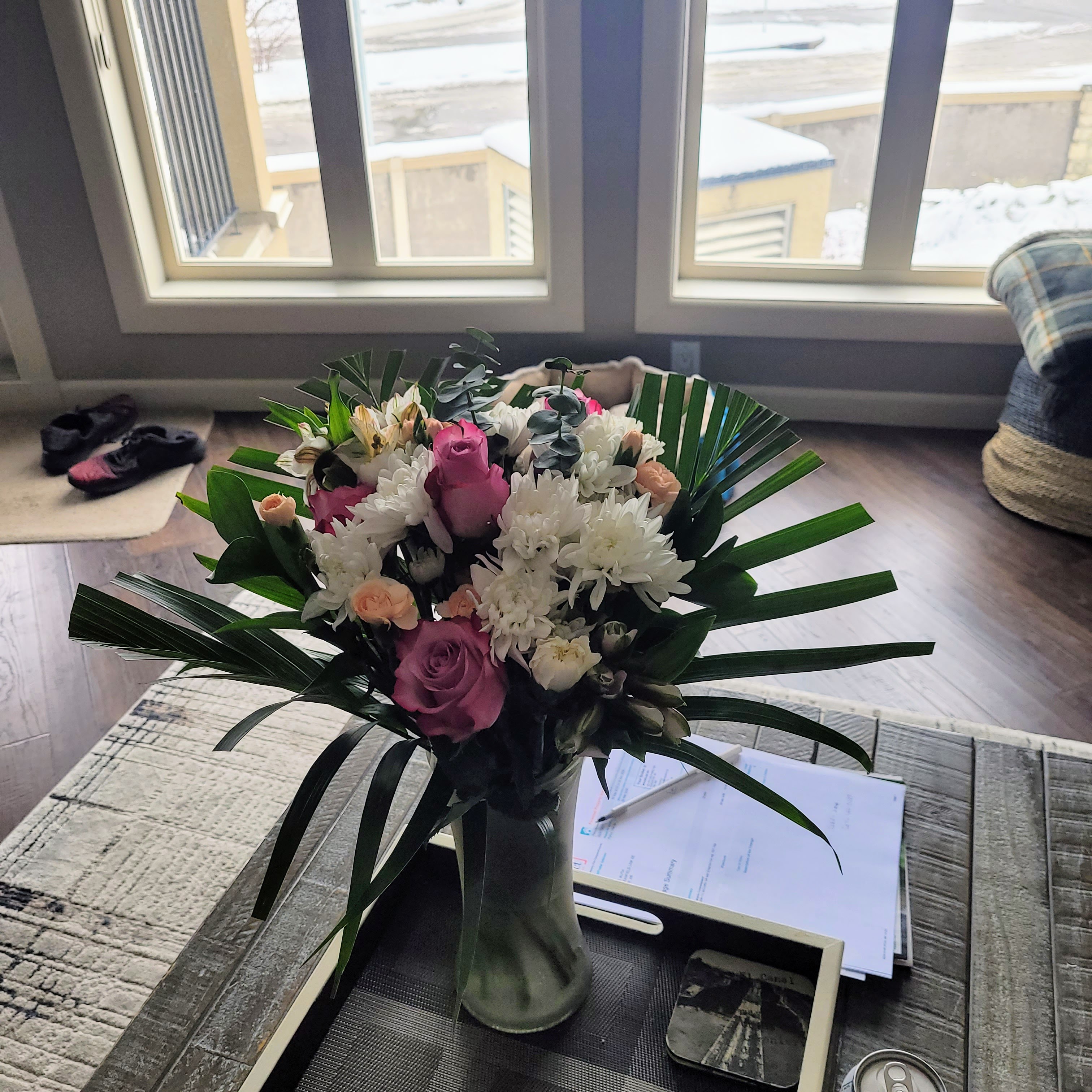 Two bouquets of flowers. First one from Jeff & Wendy and now one from Alan & MaryAnn. Quite beautiful having both of them on display and smell so nice.