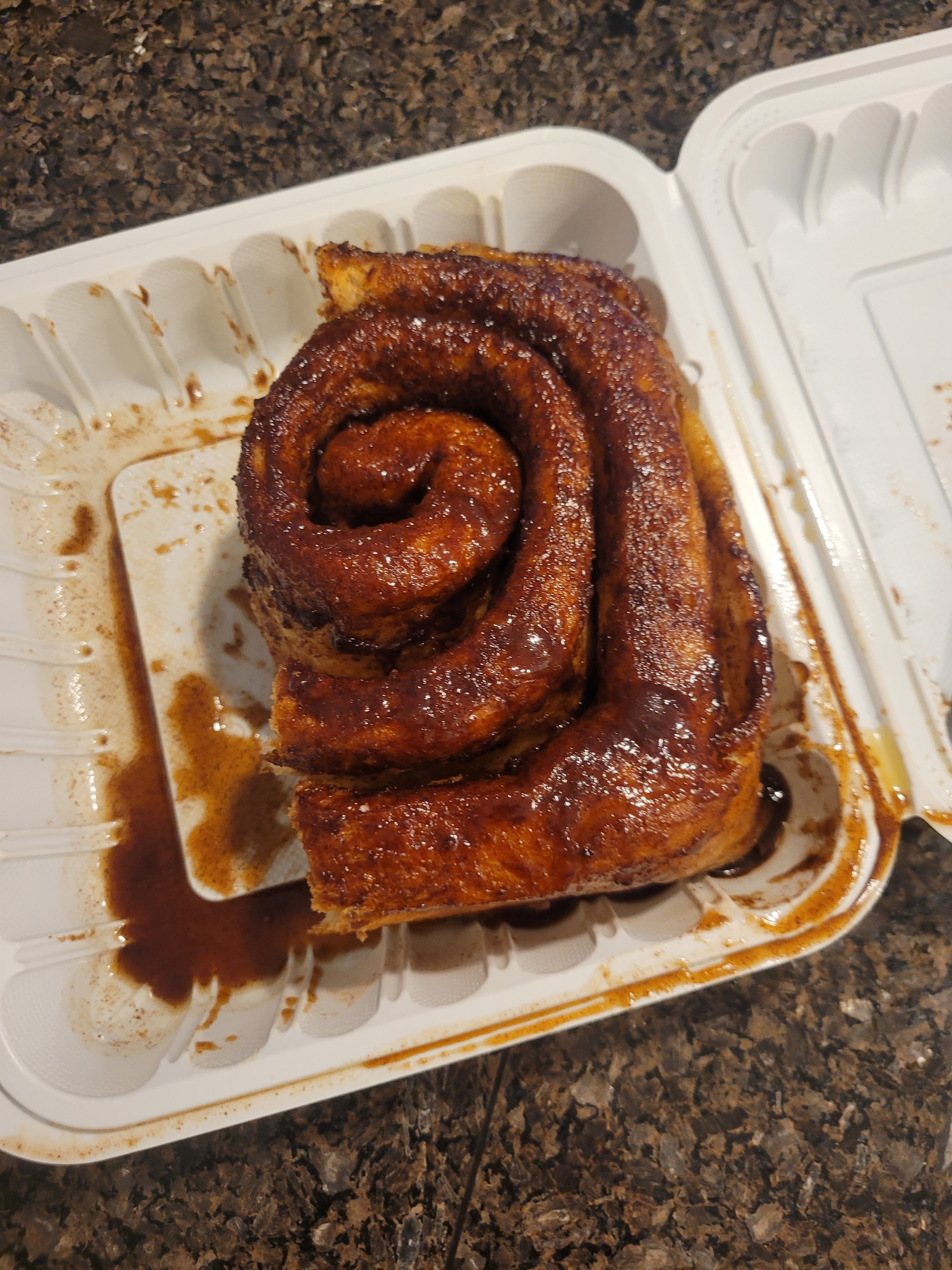 After the round, we hit Roy’s for supper, where they have 8‑inch square cinnamon buns. These things weren’t pastries — they were architectural structures. You don’t eat them; you negotiate with them.