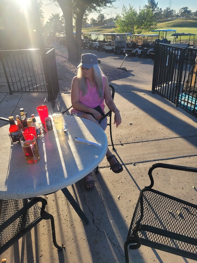 So we pivoted and decided to have a date night ourselves on the deck at Fats. It was over 100 degrees today and at supper time still 80 degrees plus. It was absolutely beautiful over looking the fairway sitting on the deck. Our young waitress was awesome as was the food. 24 ounce cold beer in a huge mug is just cool.