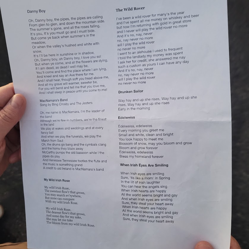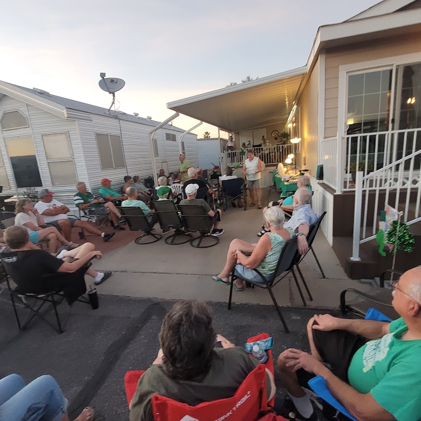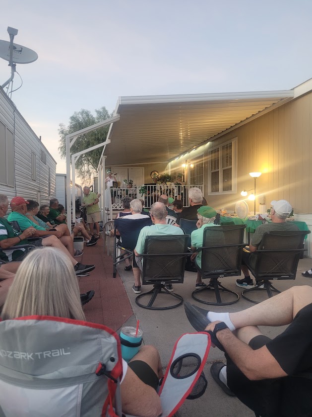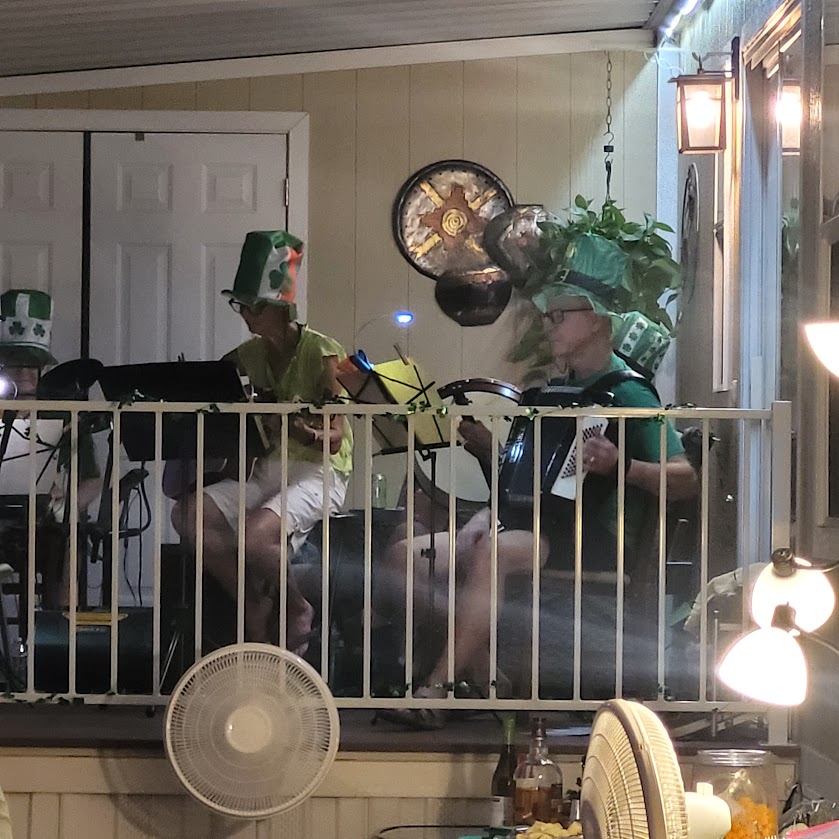 Next up was Marge & Joel Patty Day party. They do such a good job. I would bet there was over 50 people at least with their chairs set up to watch the show. I love the theatre behind the show with Marge introducing each player that was going to be on a different instrument coming out of the door of the house. We had Marge singing, Joel playing his accordion, Ellen playing the guitar and Mary with the flute that we knew. Plus the the other instrument people in the background. Marge created lyric sheets for everybody to have so that we could sing along with them. All of the favored Irish songs were sung and some of them were fantastic with people clapping and singing along. great food to accompany it and we even had Jameson shots.