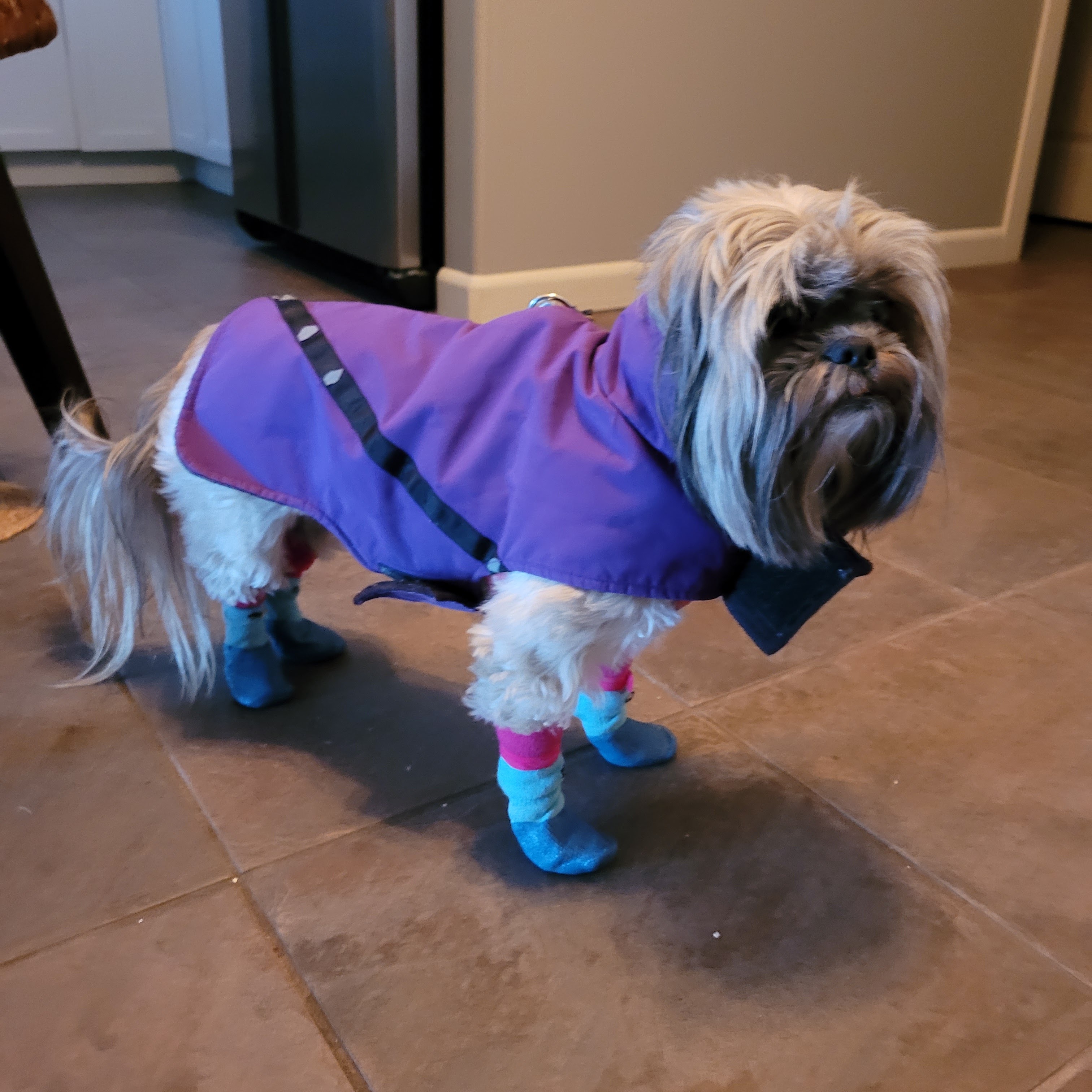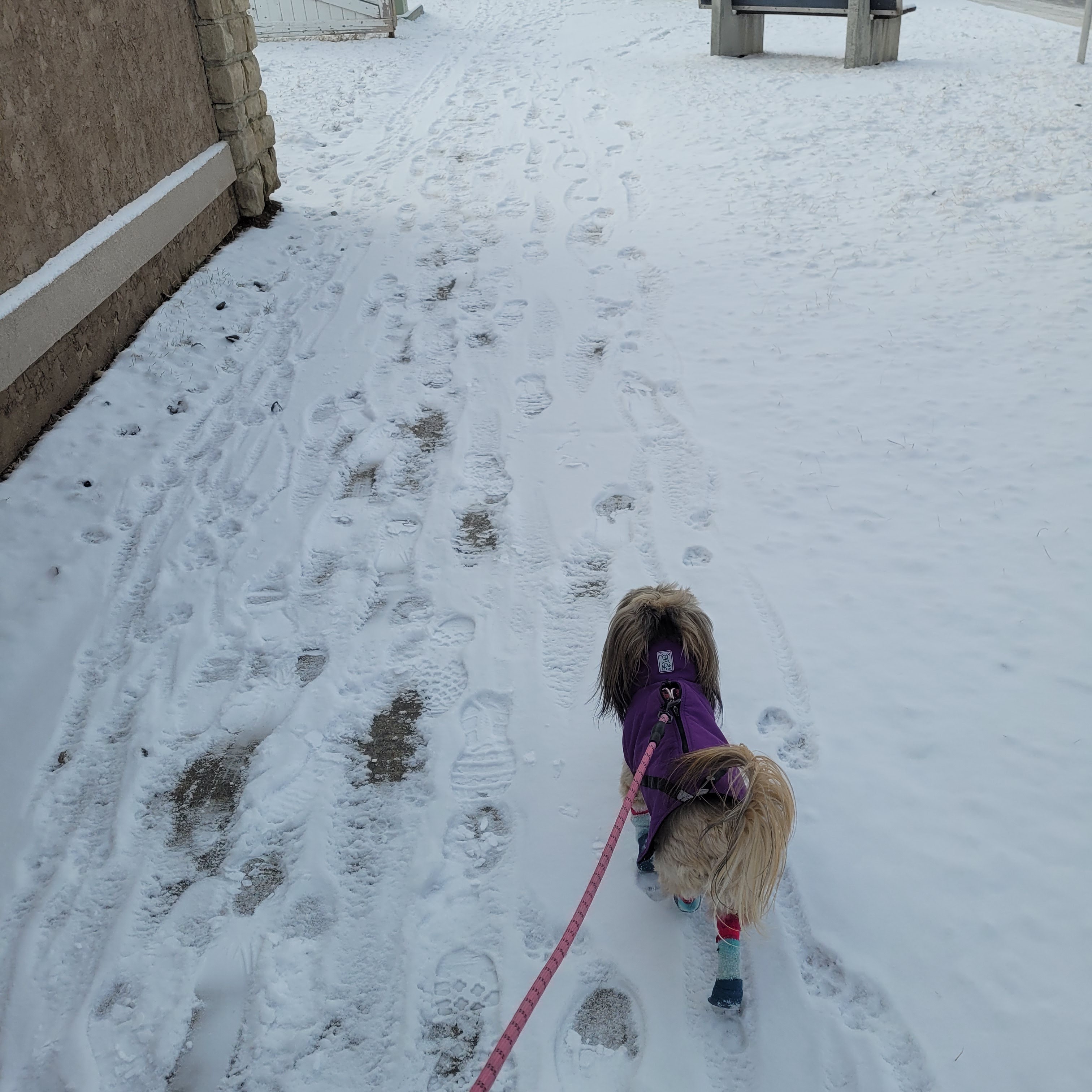 Daisy doesn’t mind the cold when she is dressed up in booties and coat. She walks very briskly when cold as it was -23 with the wind chill this am. She does miss her friends back in Mesa .