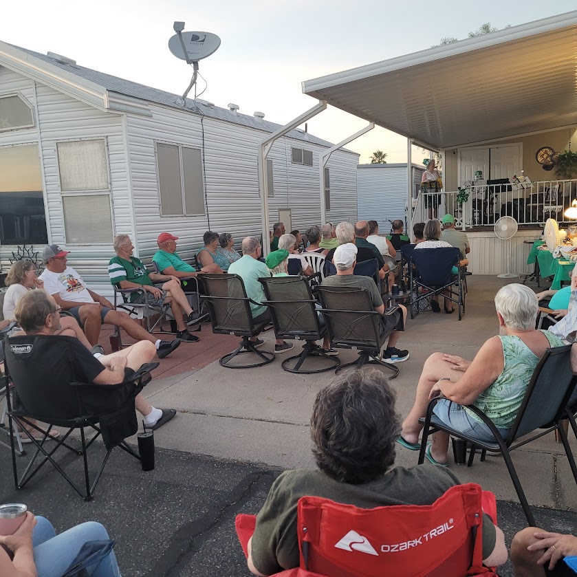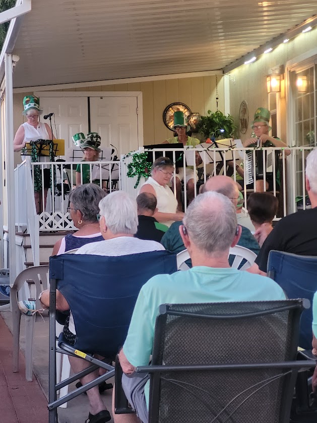 Next up was Marge & Joel Patty Day party. They do such a good job. I would bet there was over 50 people at least with their chairs set up to watch the show. I love the theatre behind the show with Marge introducing each player that was going to be on a different instrument coming out of the door of the house. We had Marge singing, Joel playing his accordion, Ellen playing the guitar and Mary with the flute that we knew. Plus the the other instrument people in the background. Marge created lyric sheets for everybody to have so that we could sing along with them. All of the favored Irish songs were sung and some of them were fantastic with people clapping and singing along. great food to accompany it and we even had Jameson shots.